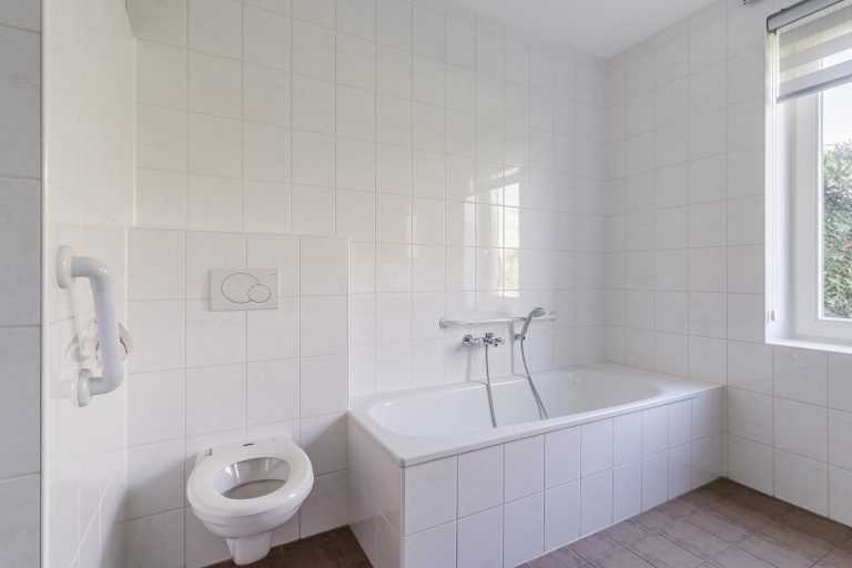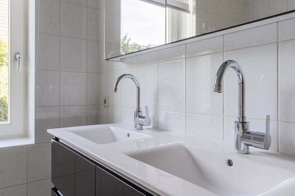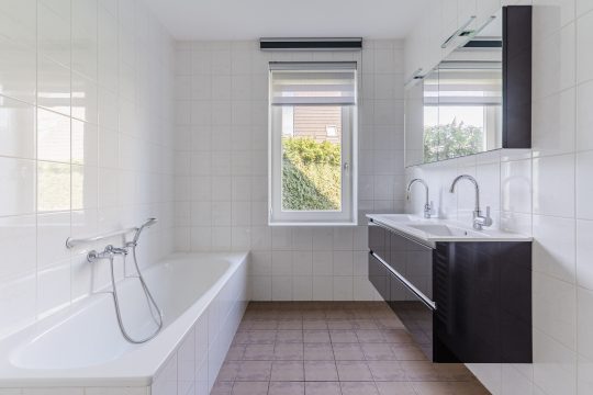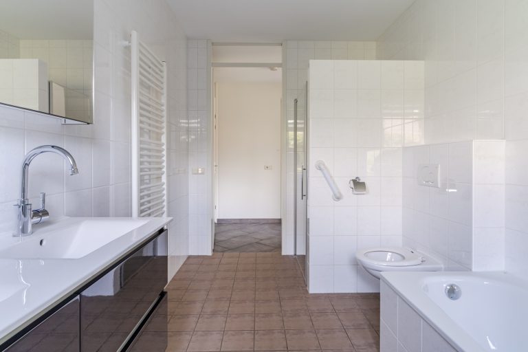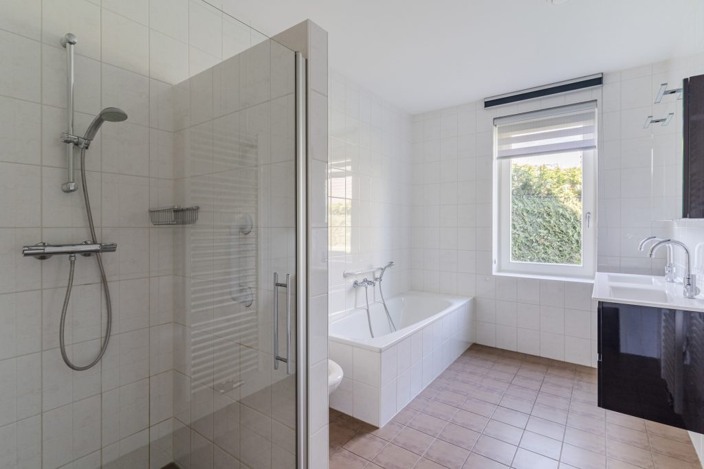 De badkamer is volledig betegeld in een neutrale kleurstelling en biedt veel comfort. U vindt hier een ligbad, een inloopdouche met glazen wand, een dubbele wastafel met meubel, een tweede toilet en een designradiator. De ruimte is bovendien geschikt voor mindervaliden.
