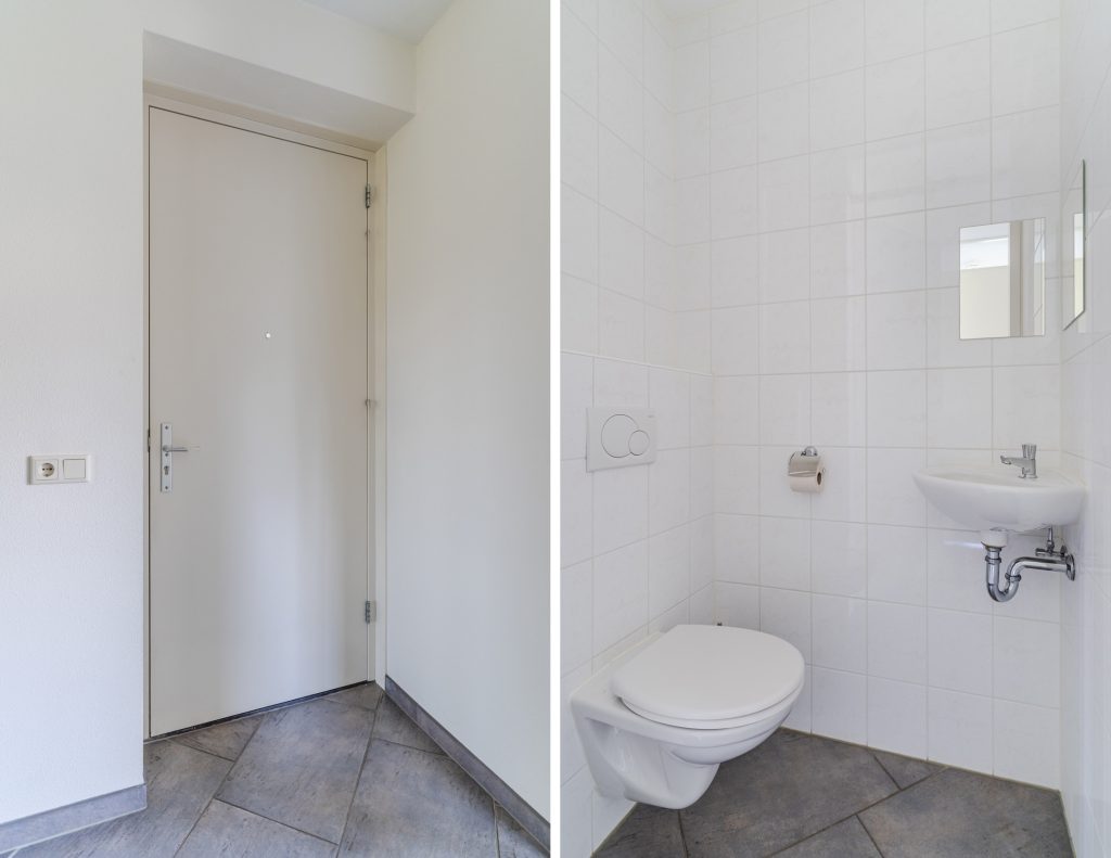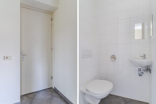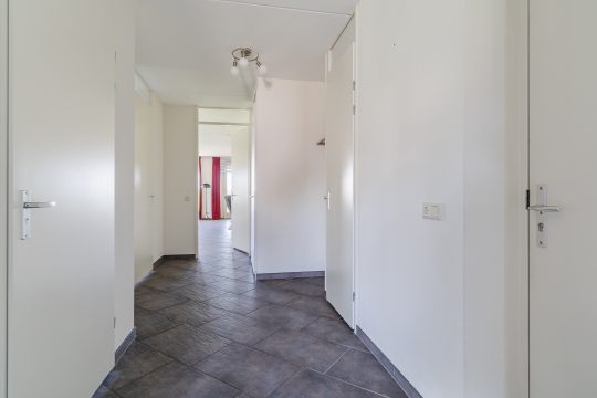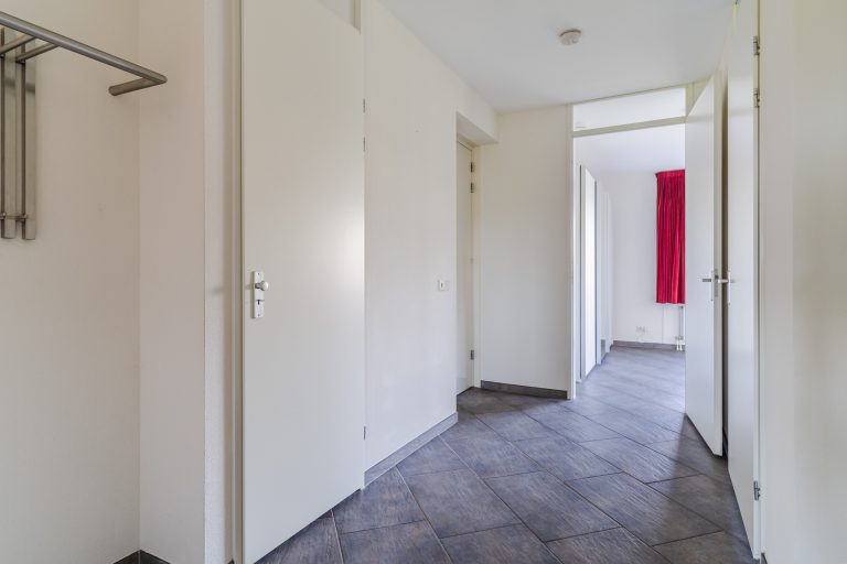 De ruime hal verwelkomt u met een nette tegelvloer en geeft toegang tot alle vertrekken. Hier vindt u tevens de garderobenis, een uitgebreide meterkast (9 groepen en krachtstroom) en een modern, licht betegeld toilet met vrijhangend closet en fonteintje.