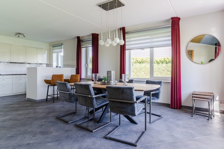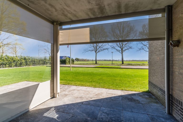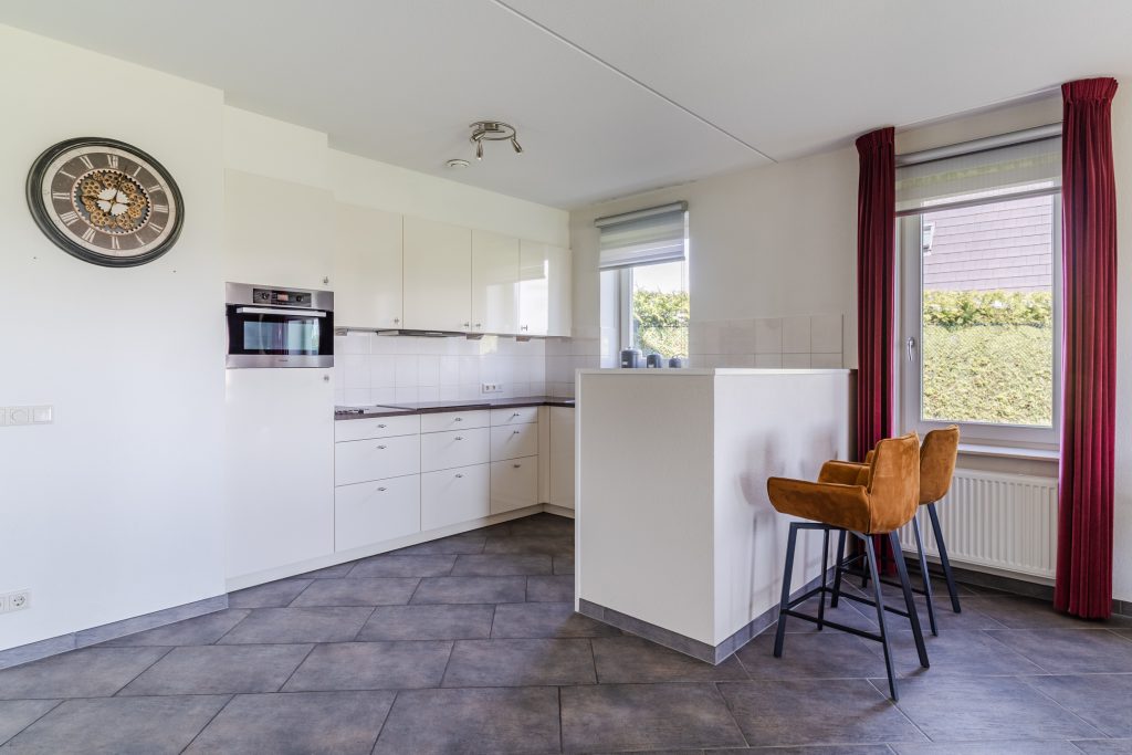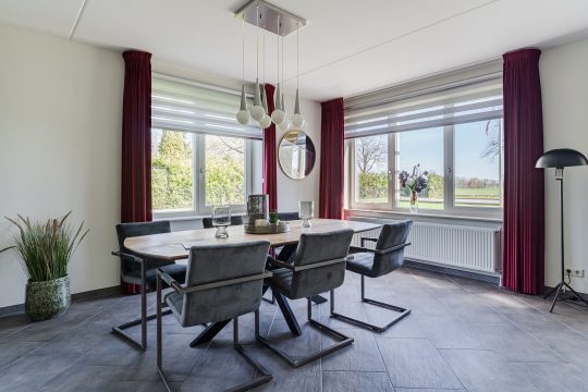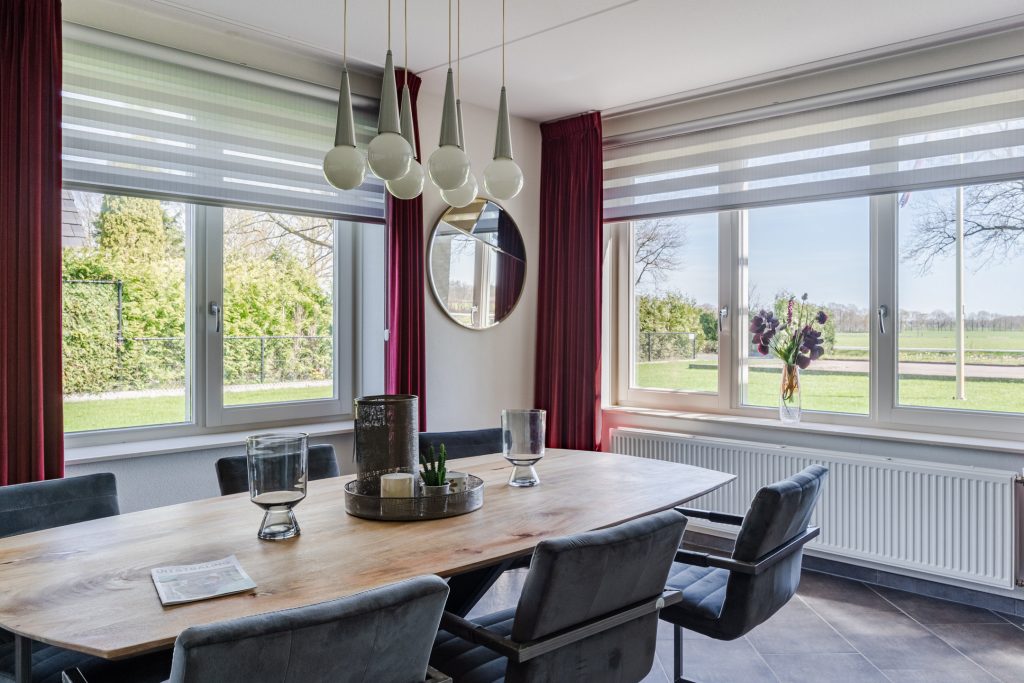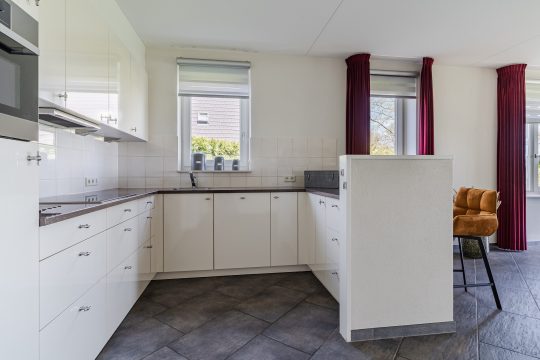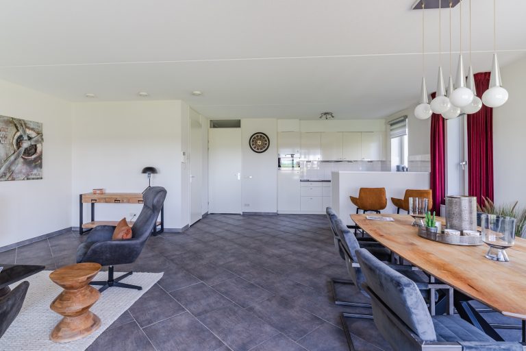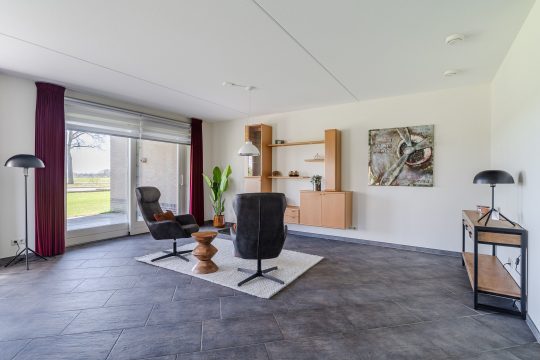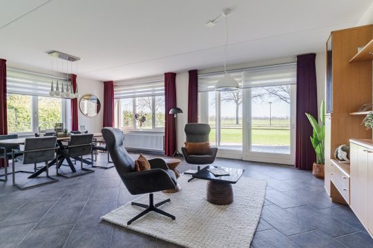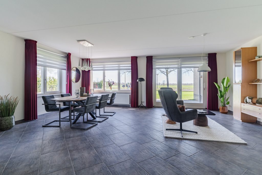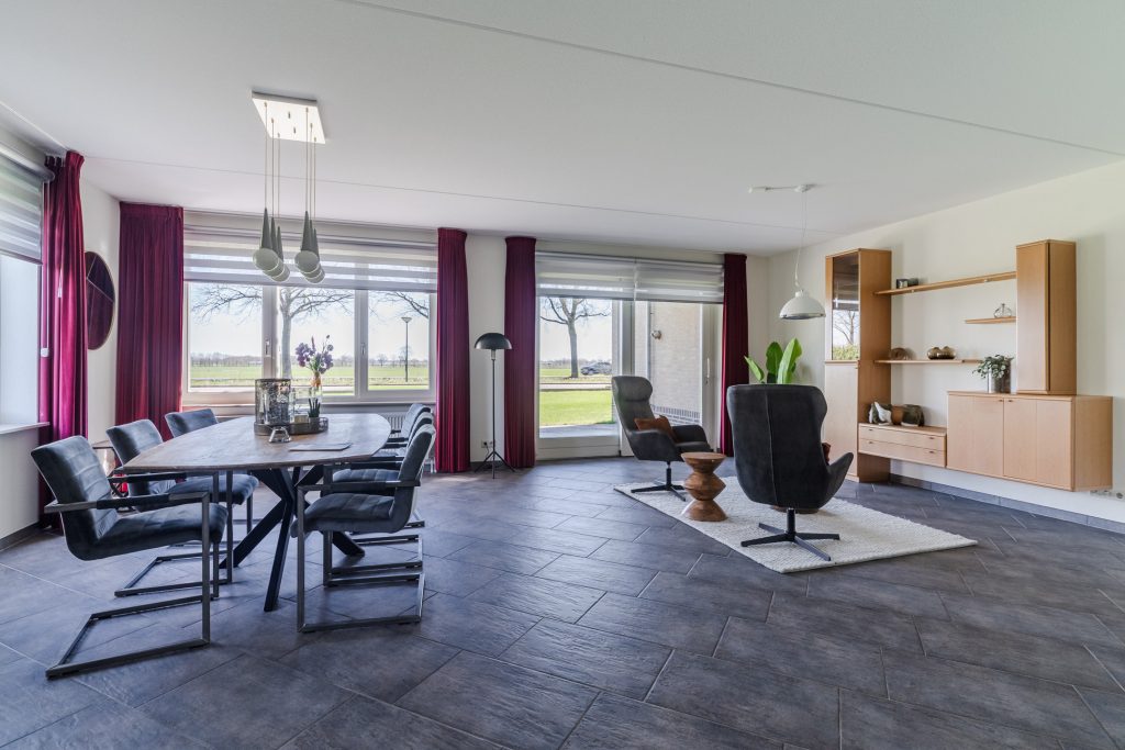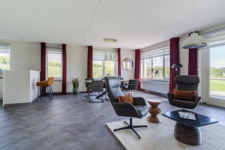 De royale woonkamer met open keuken (samen ca. 56 m²) vormt het hart van de woning. Dankzij de grote raampartijen geniet u van een overvloed aan natuurlijk licht en een prachtig vrij uitzicht over weilanden en landerijen. De woonkamer is voorzien van een tegelvloer, spachtelputzwanden, spuitwerkplafond en een schuifpui met toegang tot een riant, deels overdekt terras met elektrisch bedienbare windschermen.