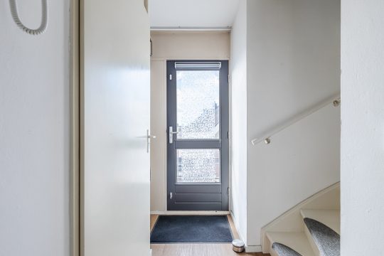 Centrale entree met bellentableau, brievenbussen en trapopgang naar de appartementen. De privé-berging is eveneens op de begane grond gelegen, aan de achterzijde van het appartementencomplex.