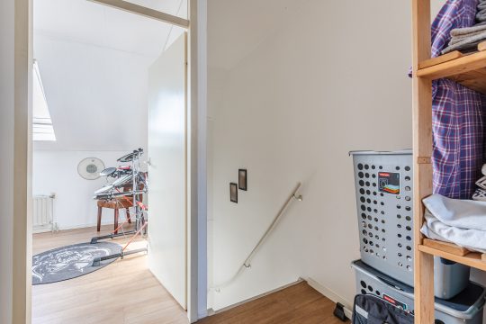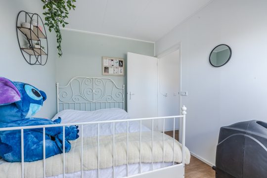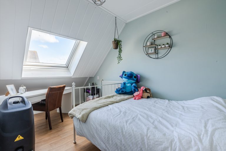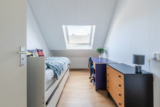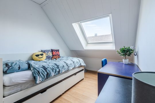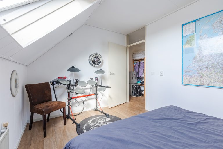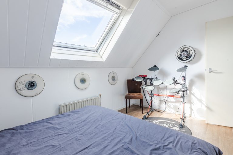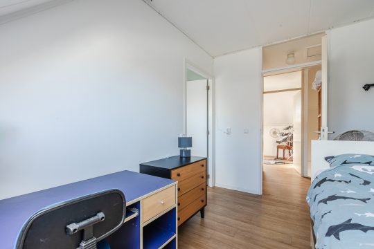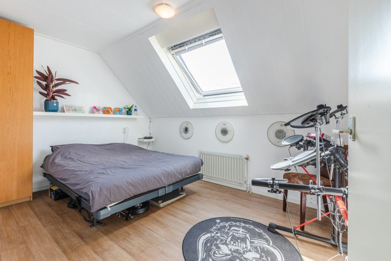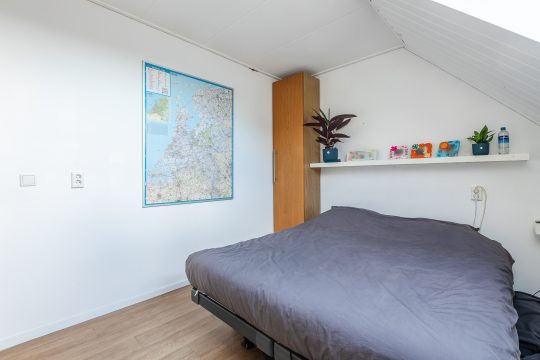 De grootste slaapkamer is opgesplitst in 2 kleinere slaapkamers, beiden met een vinylvloer en Velux dakvenster. De scheidingswand is eenvoudig te demonteren, waardoor er weer 1 grote slaapkamer kan worden gerealiseerd.