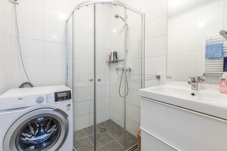 Volledig betegelde gemoderniseerde badkamer met een douchecabine, wastafelmeubel, designradiator en wasmachine-aansluiting.