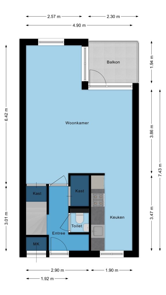 Galerij met eigen vernieuwde meterkast (6 groepen en 3 aardlekschakelaars) en toegang tot het appartement.