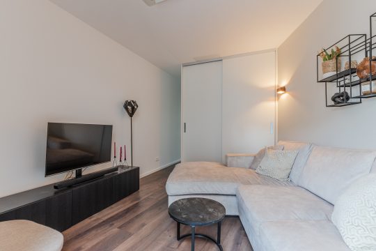 Via entreehal te bereiken woonkamer welke voldoende plaats biedt voor een grote hoekbank. Ook deze ruimte is weer strak afgewerkt met een laminaat vloer, stucwerk wanden en stucwerk plafonds en is voorzien van airconditioning en infraroodverwarming. De maatwerk kast / roomdivider scheidt de woonkamer slim van de slaapkamer, zodat je privacy en volop bergruimte hebt zonder dat de openheid verloren gaat.
