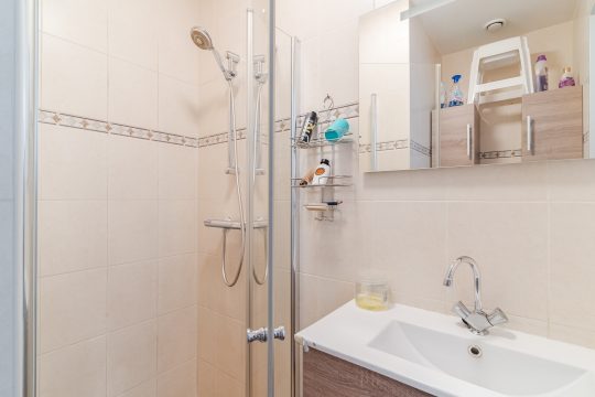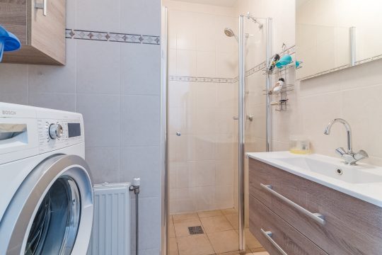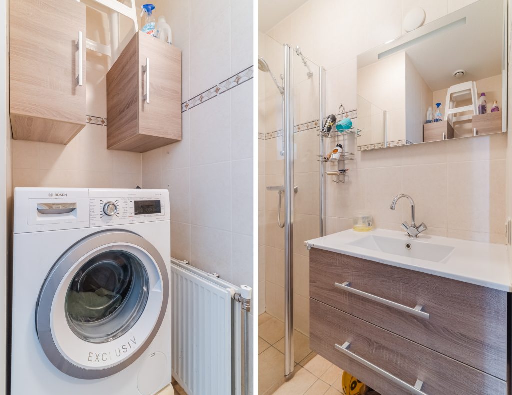 De volledig betegelde badkamer is compleet ingericht met een douchecabine, wastafelmeubel en een aansluiting voor je wasmachine.