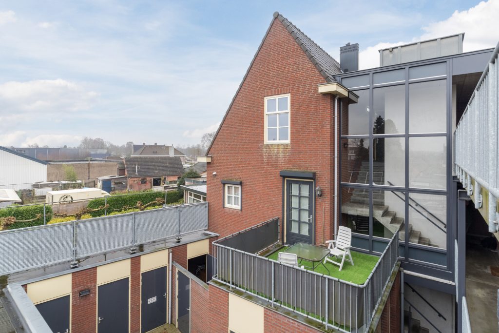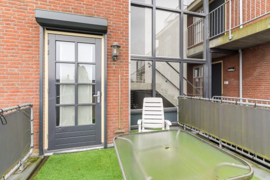 Via de galerij op de eerste verdieping bereik je de voordeur van het appartement.