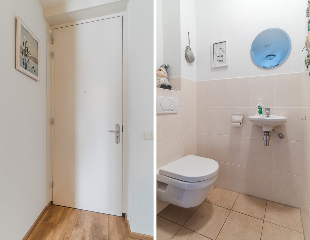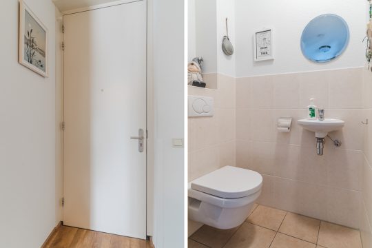 In de hal valt direct de nette afwerking op, met een laminaatvloer, een praktische garderobenis en een moderne meterkast. Vanuit de hal heb je toegang tot de gedeeltelijk betegelde toiletruimte met wandcloset en fonteintje en tot de c.v.-ruimte met opstelling van de c.v.-installatie en de mechanische ventilatie-unit.