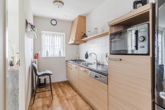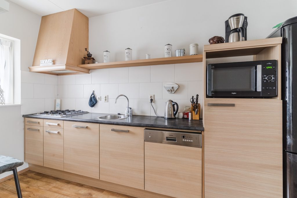 De open keuken sluit naadloos aan op de woonkamer en is uitgevoerd in een nette wandopstelling met gaskookplaat, afzuigkap, vaatwasser, koel-/vriescombinatie en magnetron.