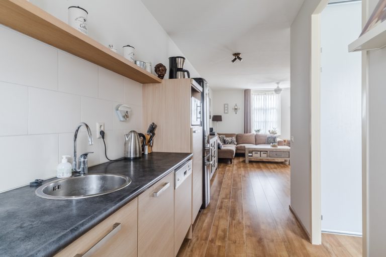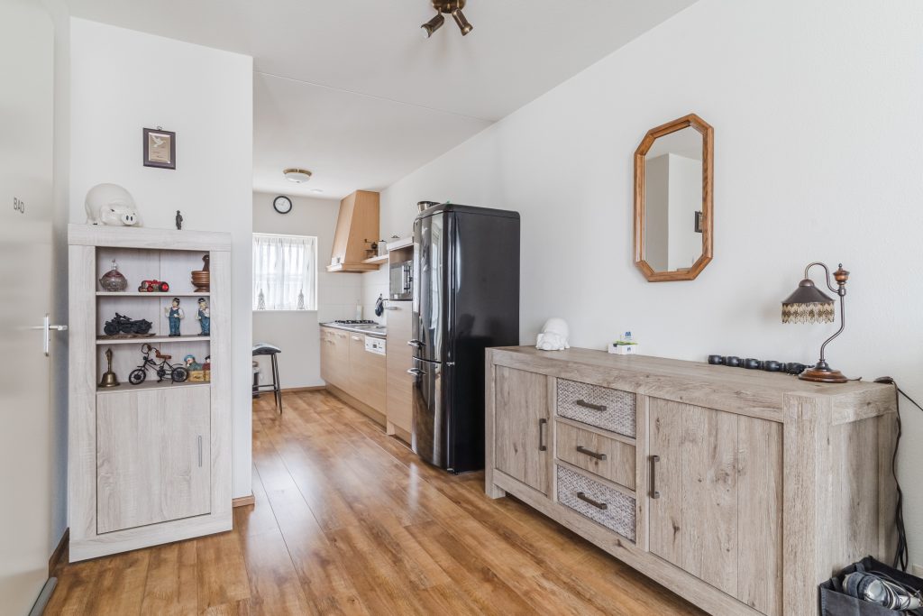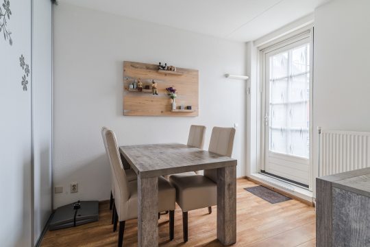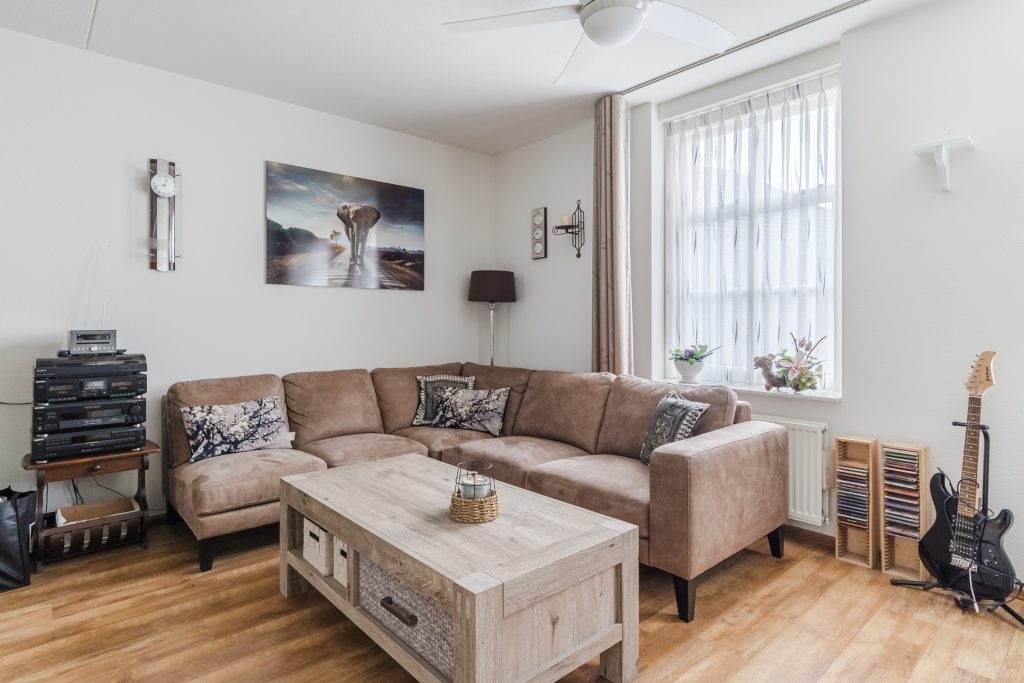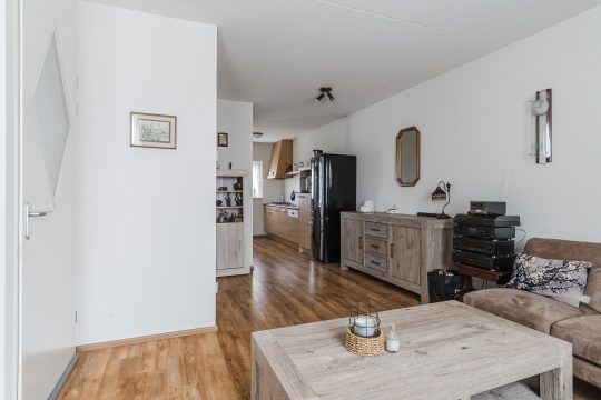 De gezellige L-vormige woonkamer is heerlijk licht dankzij de grote raampartijen en biedt je een prettige leefruimte met vrij uitzicht aan de voorzijde. De ruimte is afgewerkt met een laminaatvloer, gestucte wanden en een stucwerkplafond, waardoor je hier direct kunt intrekken zonder te klussen.