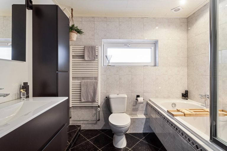 Volledig betegelde badkamer voorzien van een ligbad-/douchecombinatie toilet, badmeubel met wastafel en een