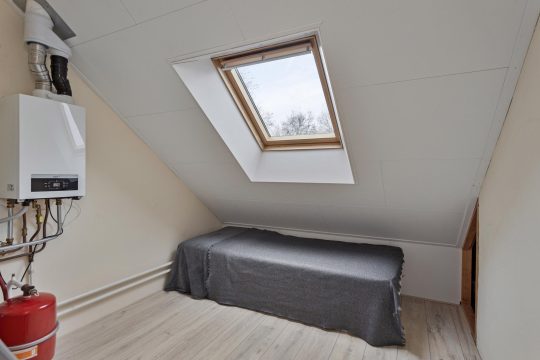 C.V.-ruimte met een laminaatvloer, dakraam en opstelling van de c.v.-installatie.
