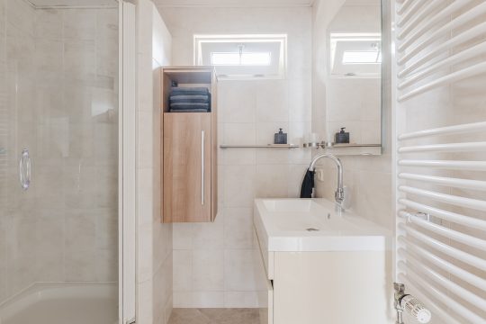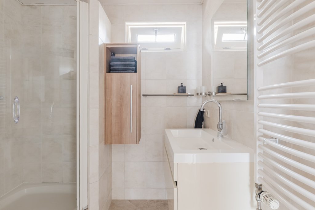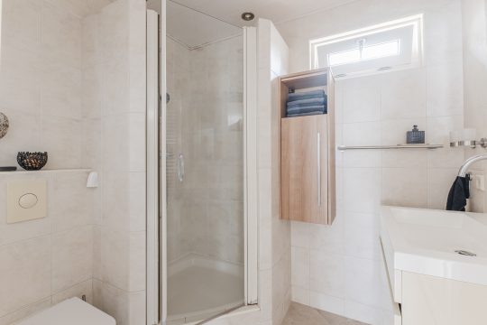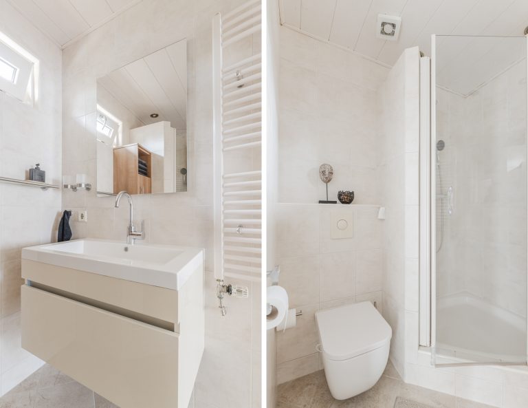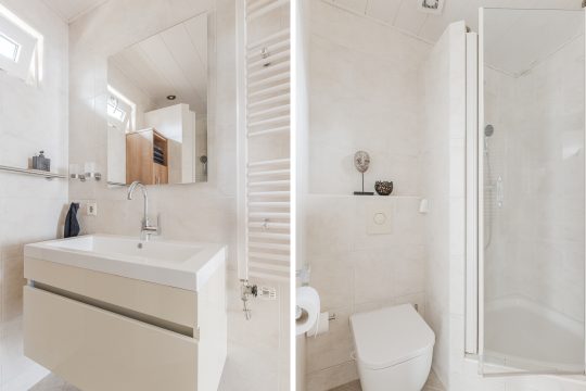 Volledig betegelde badkamer voorzien van een douchecabine, badmeubel met wastafel, wandcloset, designradiator en een MDF-plafond met inbouwspots.