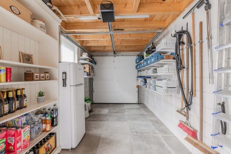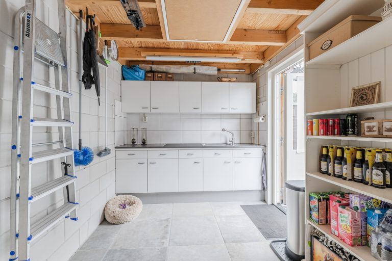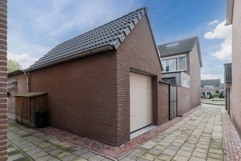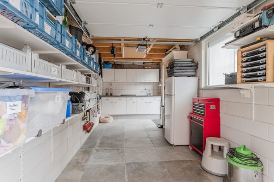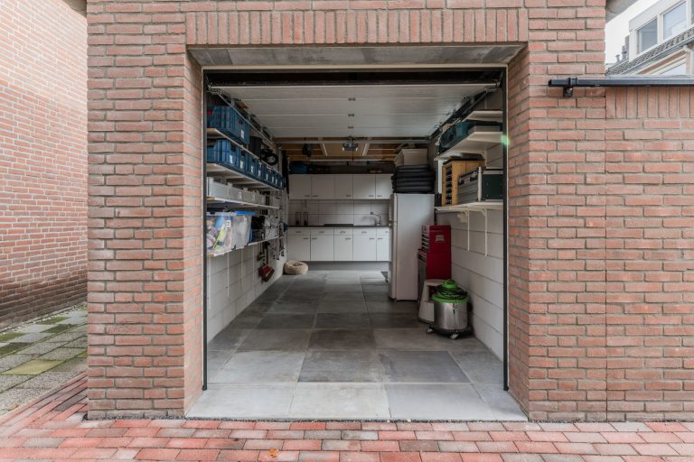 Vanuit de achtertuin is de volledig geïsoleerde berging/hobbyruimte te bereiken welke is voorzien van een tegelvloer, keukenblok met spoelbak en close-in boiler, vlizotrap met toegang tot een grote bergzolder en een elektrisch bedienbare segmentdeur met toegang tot de naastgelegen brandgang. Hierdoor is het eenvoudig om bijvoorbeeld met een motor naar binnen te kunnen rijden.