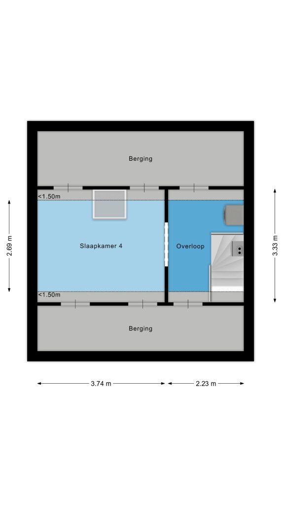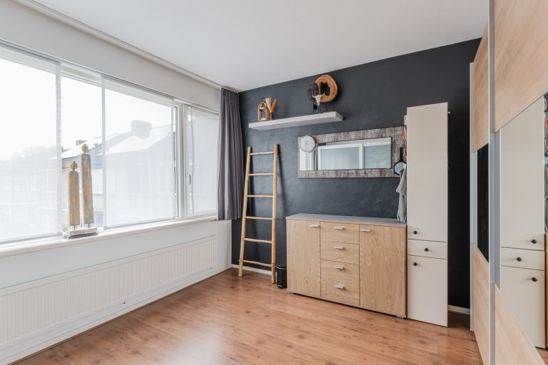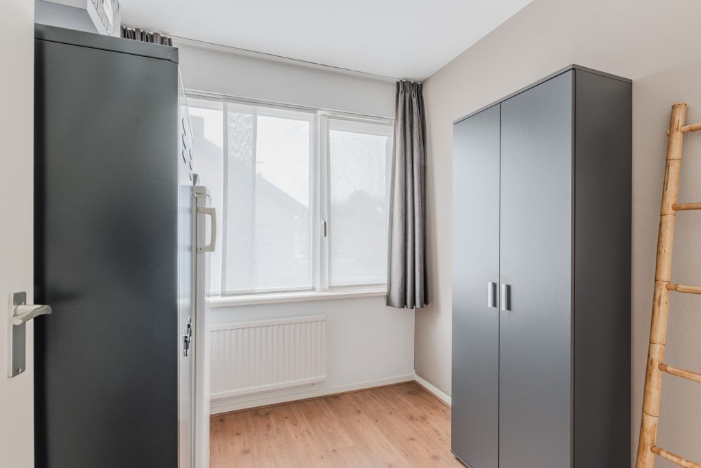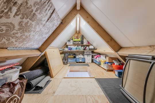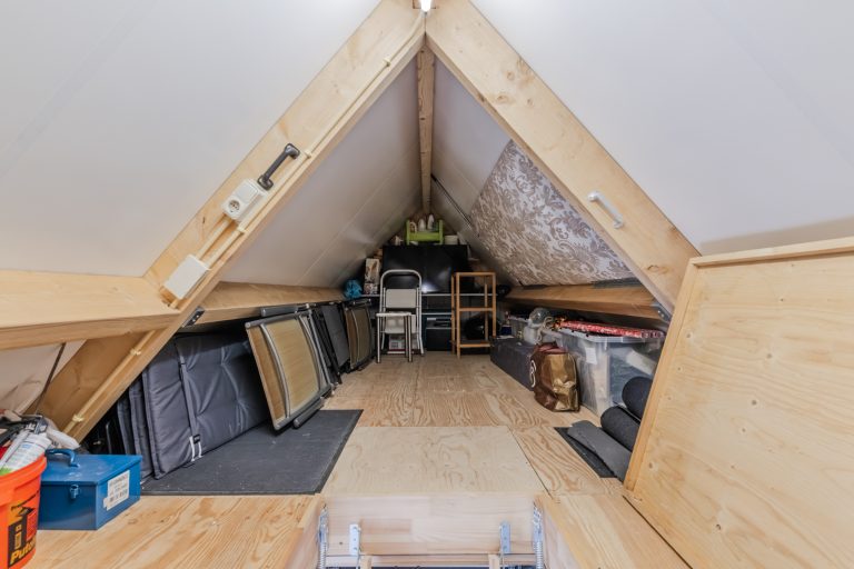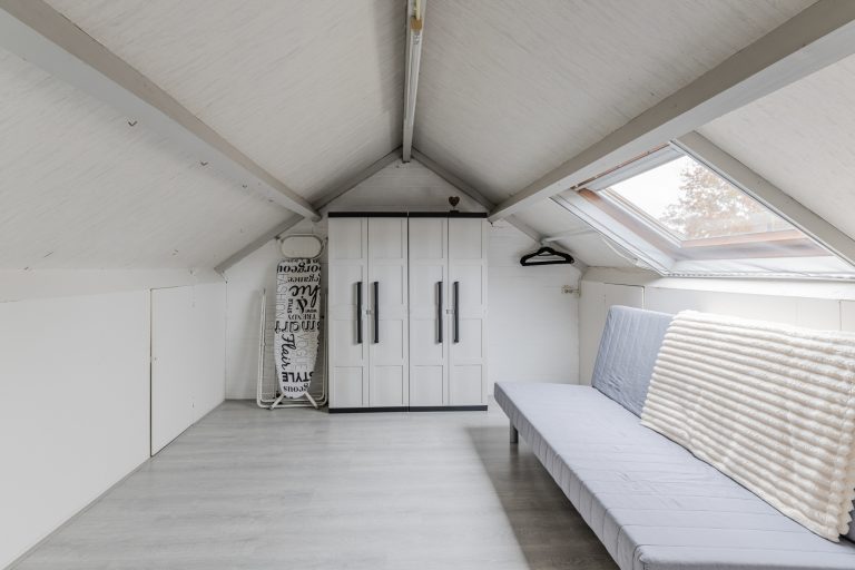 Slaapkamer 4 is voorzien van een laminaatvloer, Velux dakvenster en bergruimte aan beide zijden onder de dakschuinte.
