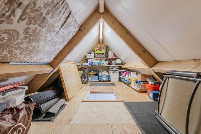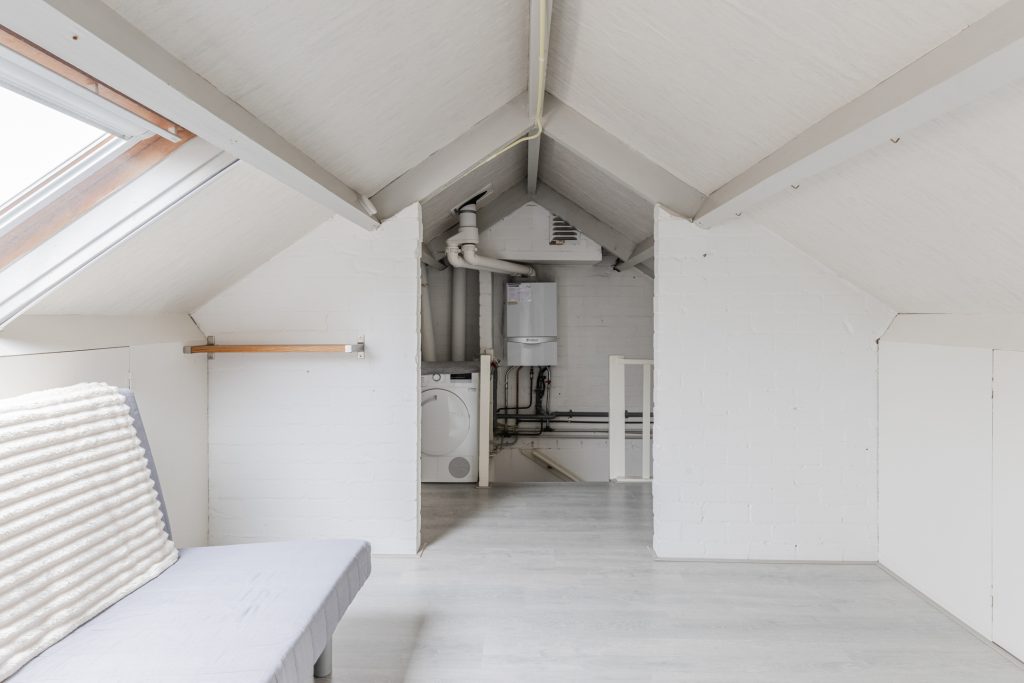 Middels een vaste trapopgang bereikbare voorzolder met een laminaatvloer, opstelling van de c.v.-installatie, wasmachine-aansluiting en bergruimte aan beide zijden onder de dakschuinte.