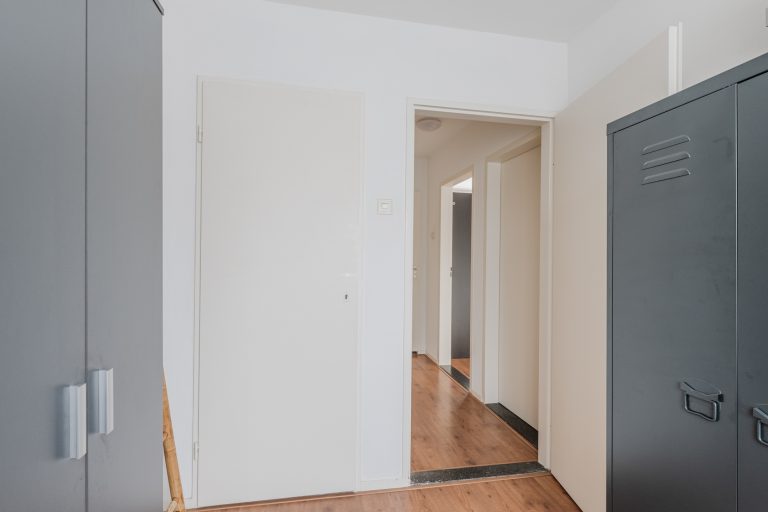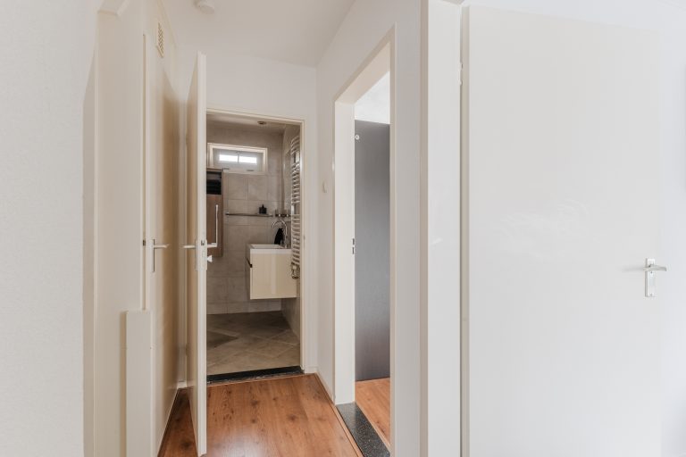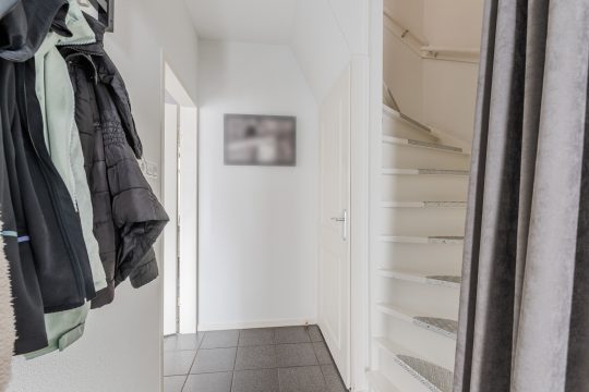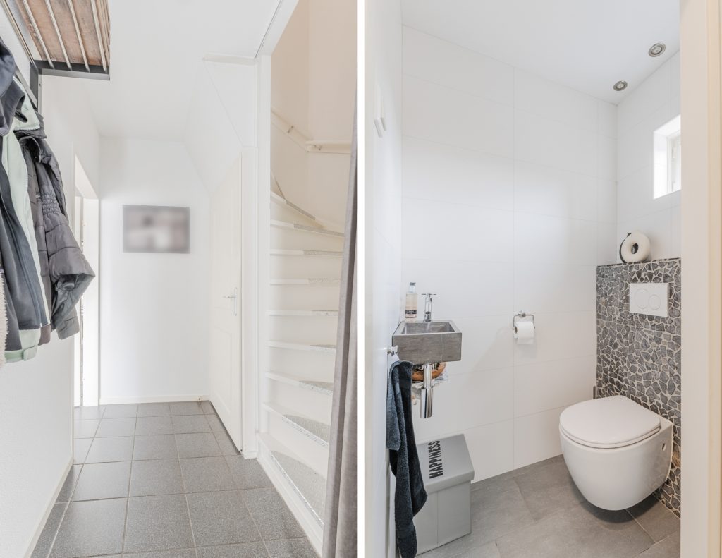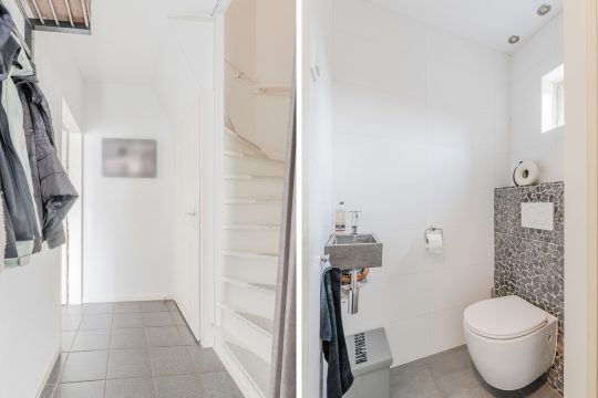 Entreehal met tegelvloer, volledig betegelde moderne toiletruimte met wandcloset en hardstenen fonteintje, meterkast (6 groepen, 1 kookgroep en 2 aardlekschakelaars), praktische trapkast, toegang tot de woonkamer en trapopgang naar de 1e verdieping.