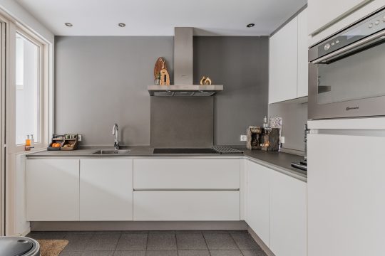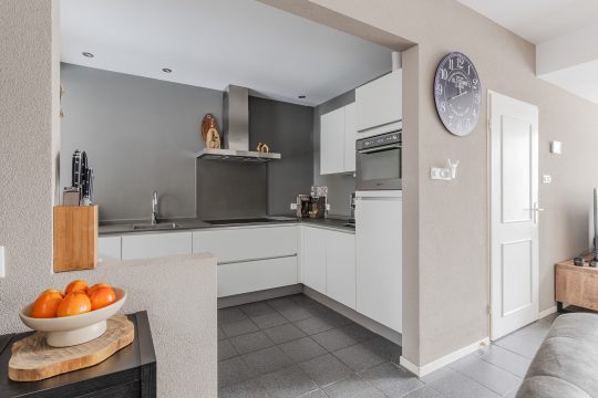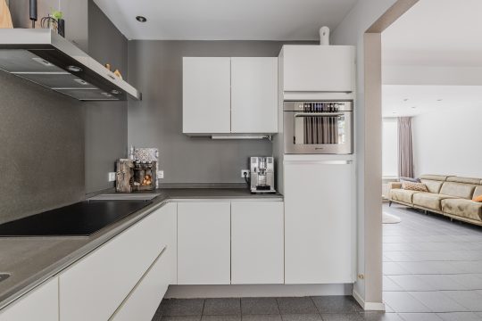 De open keuken is gesitueerd aan de achterzijde van de woning en is voorzien van een tegelvloer en moderne keukeninrichting in hoekopstelling met een inductiekookplaat, afzuigkap, combi-oven, koelkast, vaatwasser en composiet aanrechtblad.