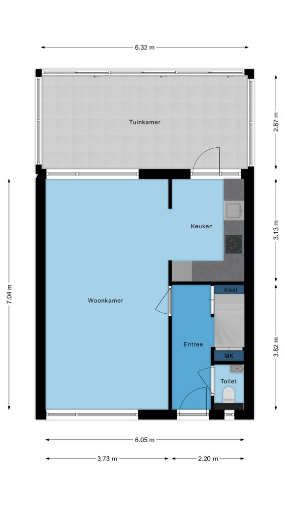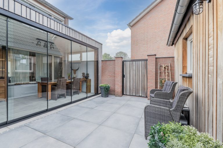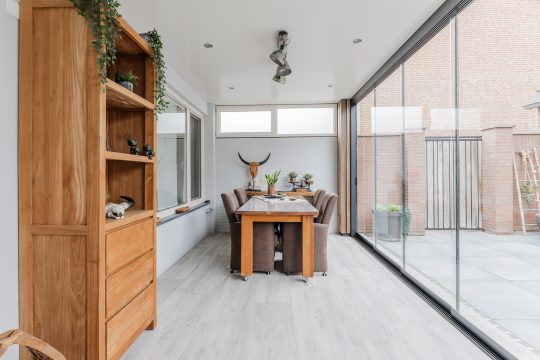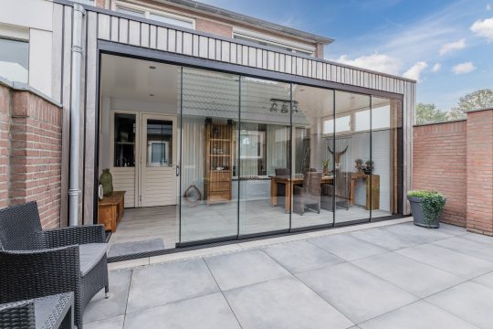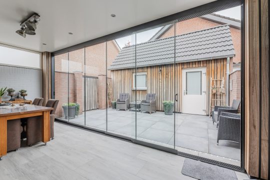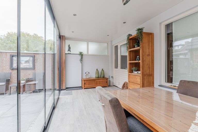 Vanuit de keuken is er direct toegang tot een prachtige aangebouwde tuinkamer met houtlook-tegelvloer, plafond met inbouwspots en meerdere glazen schuifwanden met toegang tot de achtertuin.