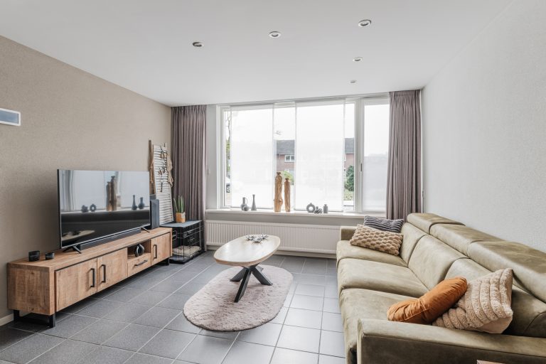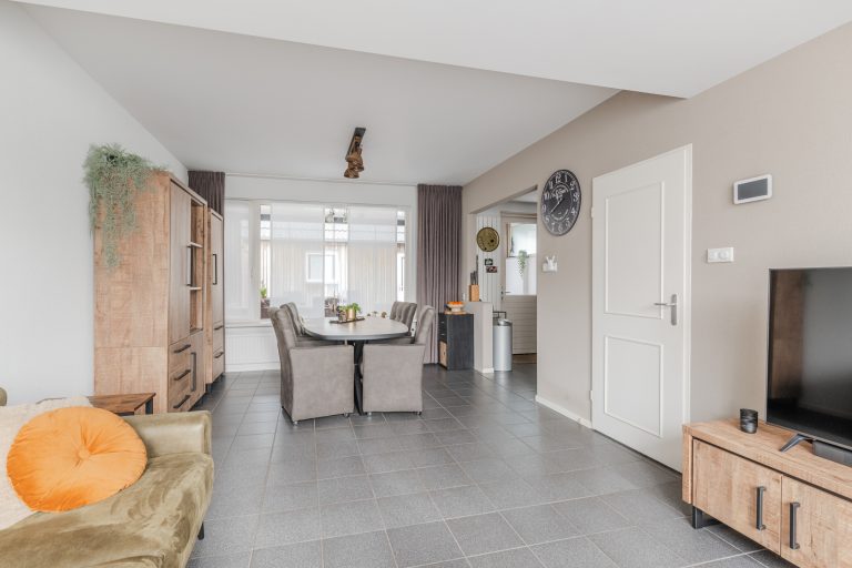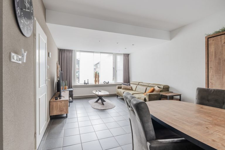Gezellige doorzon-woonkamer met een tegelvloer, spachtelputzwanden en stucwerkplafond met inbouwspots.