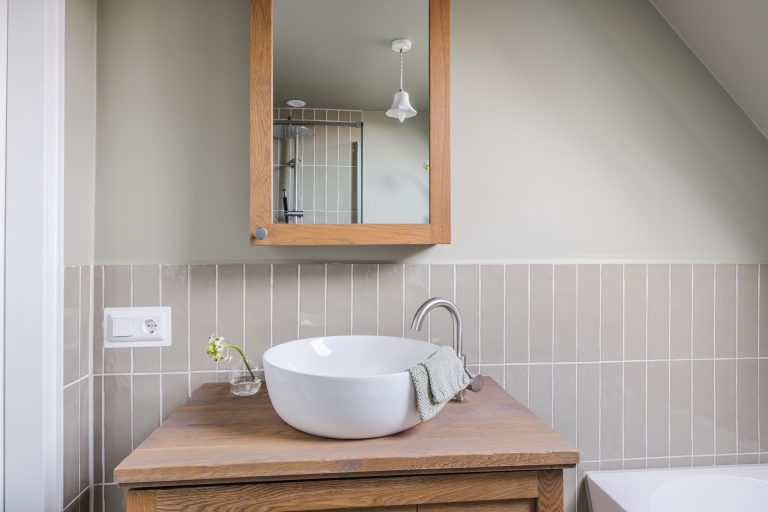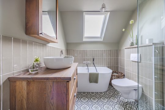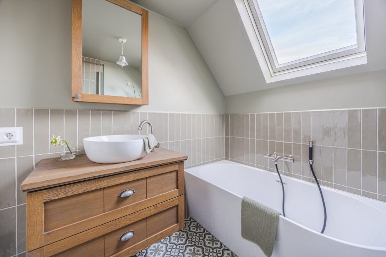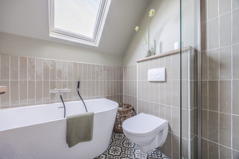 De luxe badkamer is grotendeels betegeld en compleet uitgerust met een ligbad, inloopdouche, wandcloset, stijlvol badmeubel met waskom, spiegelkast en een Velux dakvenster voor natuurlijk licht. Een heerlijke plek om na een lange dag tot rust te komen.