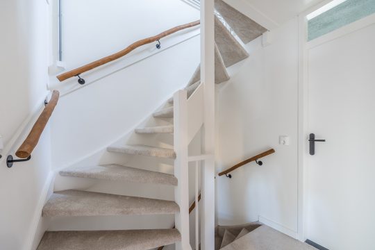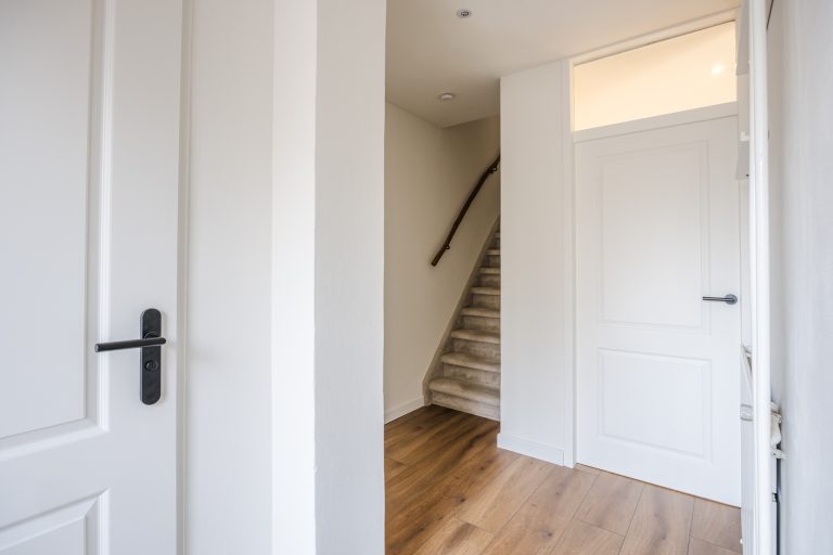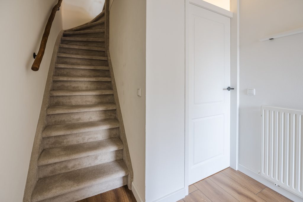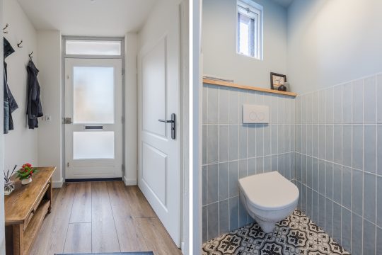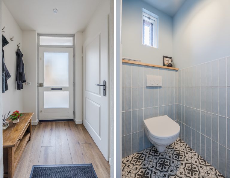 Bij binnenkomst word je verwelkomd in de nette hal met moderne PVC-vloer, vernieuwde meterkast en een luxe toiletruimte met wandcloset en fonteintje. Vanuit de hal bereik je zowel de woonkamer als de trapopgang naar boven.