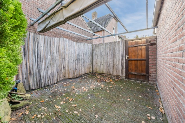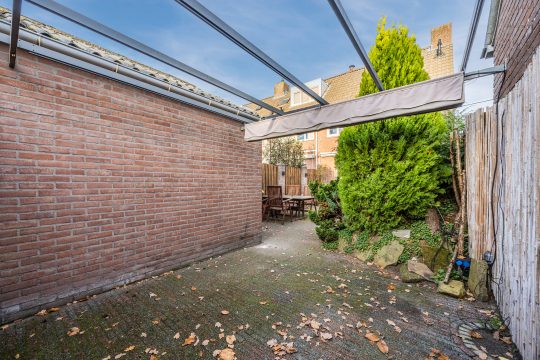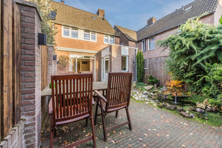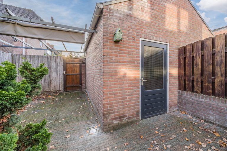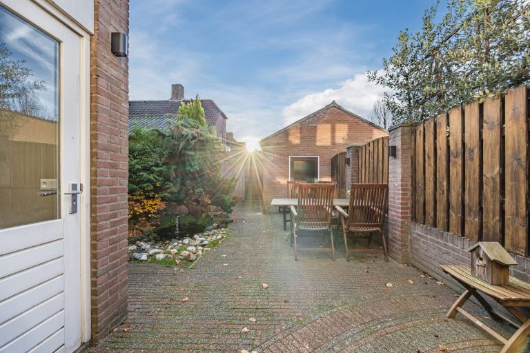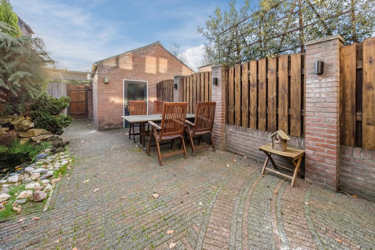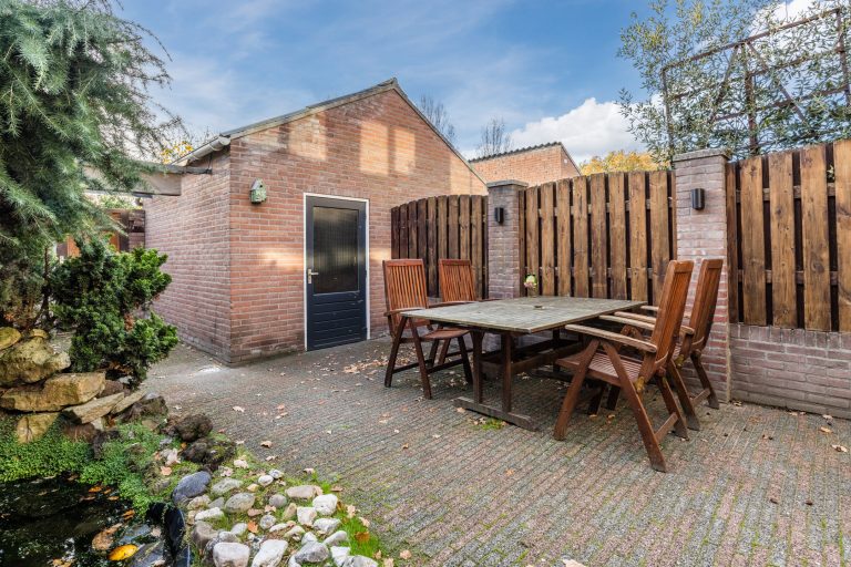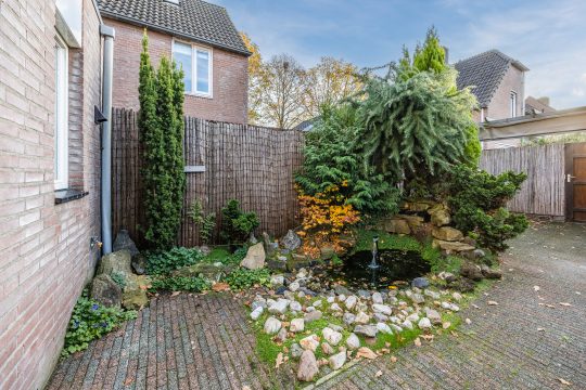 De achtertuin, gelegen op het zonnige zuid-westen, is een heerlijke plek om te ontspannen. Hier vind je sierbestrating, diverse beplanting, een vijverpartij, een royale gemetselde berging én een achterom met poort. Dankzij de ligging en het ontbreken van directe inkijk geniet je hier volop van rust en privacy.