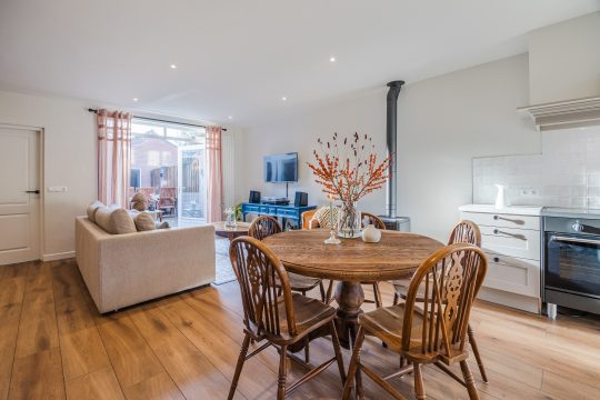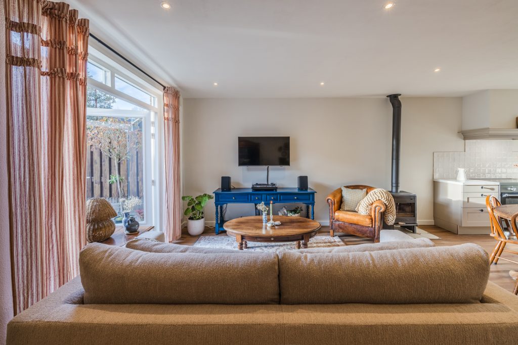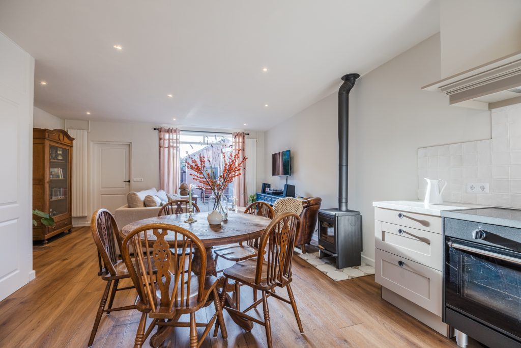 De sfeervolle woonkamer is een heerlijke plek om te vertoeven. De PVC-vloer, strak stucwerk, inbouwspots en de gezellige houtkachel zorgen voor een warme, uitnodigende uitstraling. Dankzij de openslaande tuindeuren staat de living bovendien in directe verbinding met de tuin, waardoor binnen en buiten mooi in elkaar overlopen. De praktische trapkast biedt extra opbergruimte.