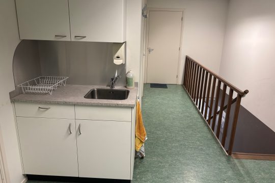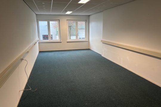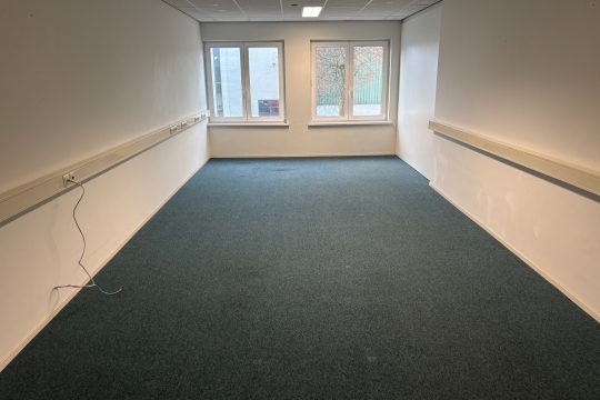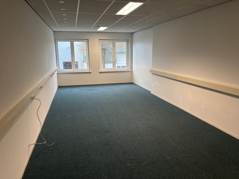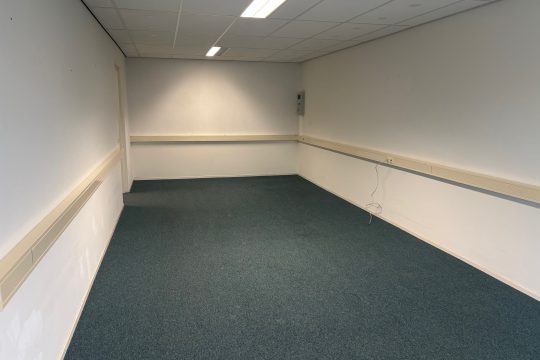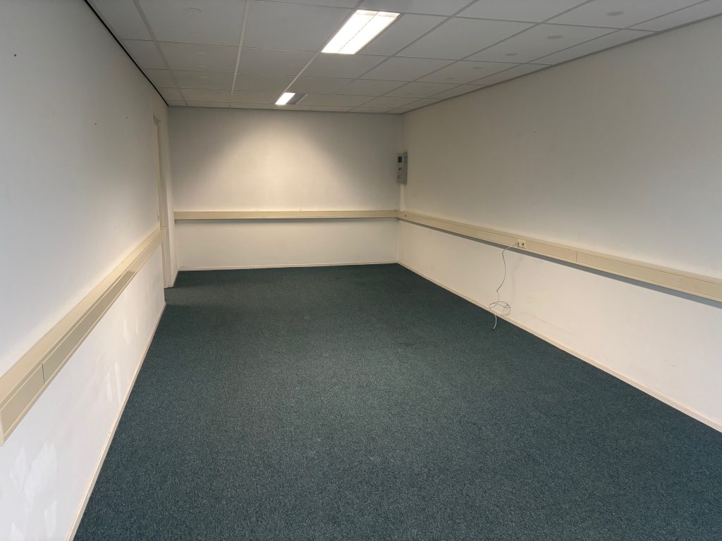 De kantoorruimte is voorzien van vloerbedekking en een systeemplafond met inbouw TL-verlichting.