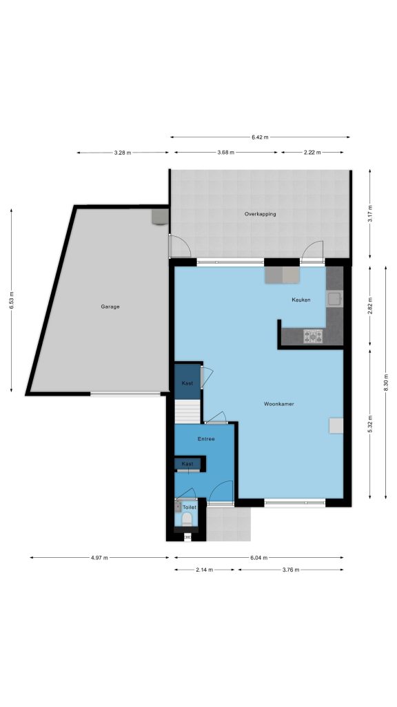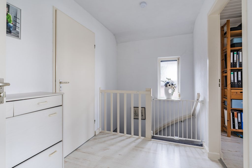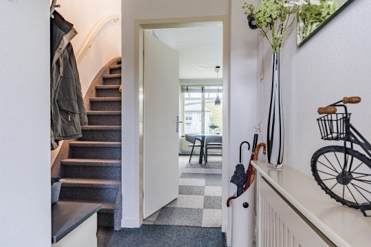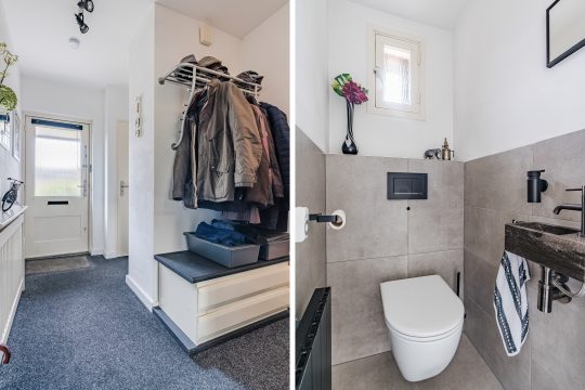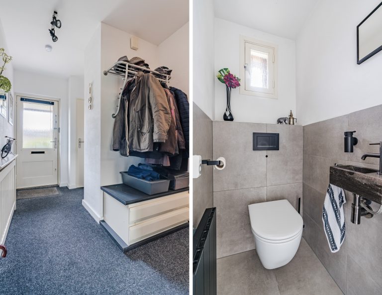 Je komt binnen in een nette entree met een vernieuwde meterkast met tien groepen, een garderoberuimte en een moderne toiletruimte met hangcloset en fonteintje. De afwerking is strak en verzorgd.