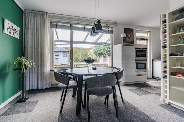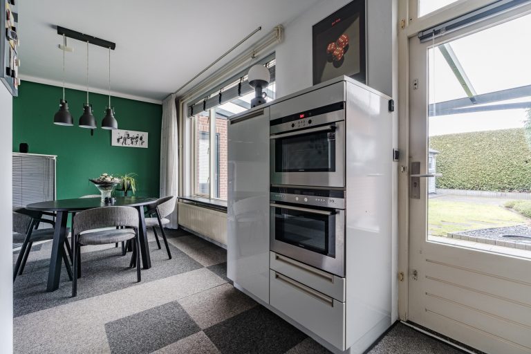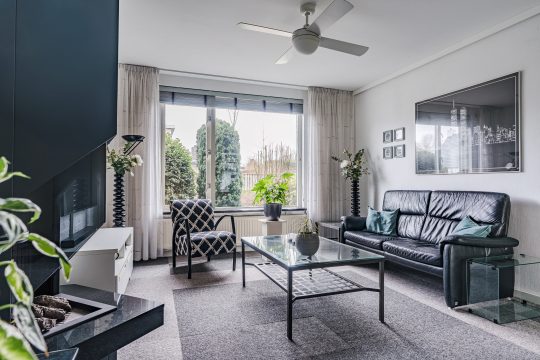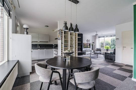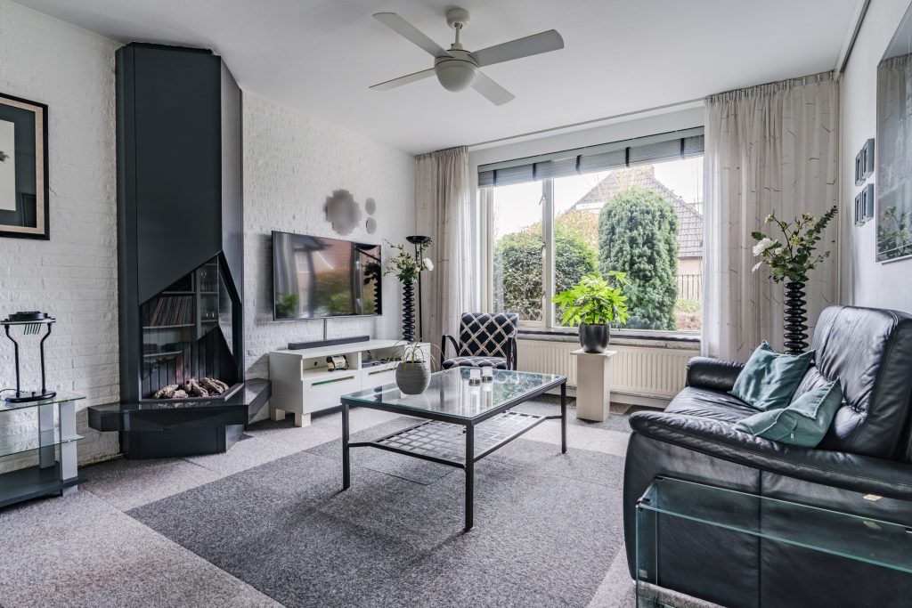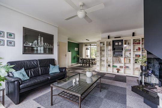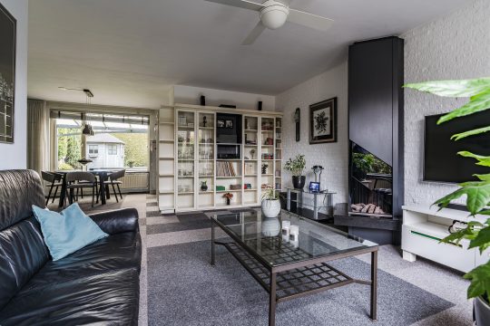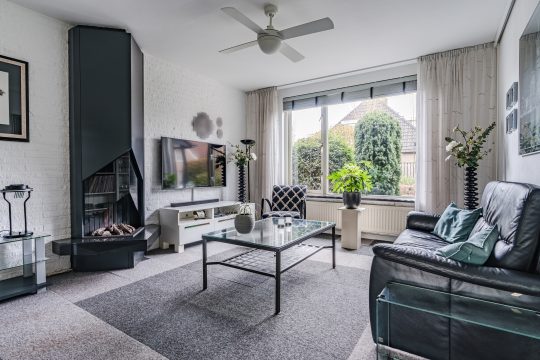 De woonkamer is opvallend ruim en zeer licht. Aan de voorzijde bevindt zich het zitgedeelte met een sfeervolle gashaard en een elektrisch zonnescreen. Een fijne plek om te ontspannen met uitzicht op de rustige straat. Aan de achterzijde ligt het eetgedeelte, met directe aansluiting op de open keuken. Hier vind je ook een praktische trapkast voor extra bergruimte.