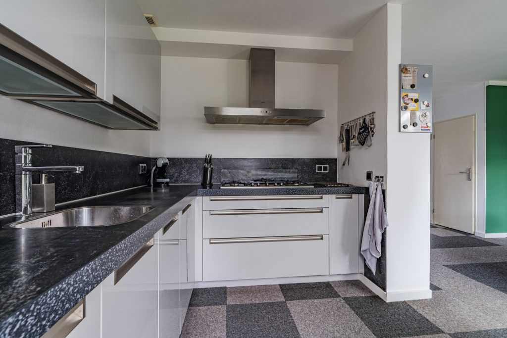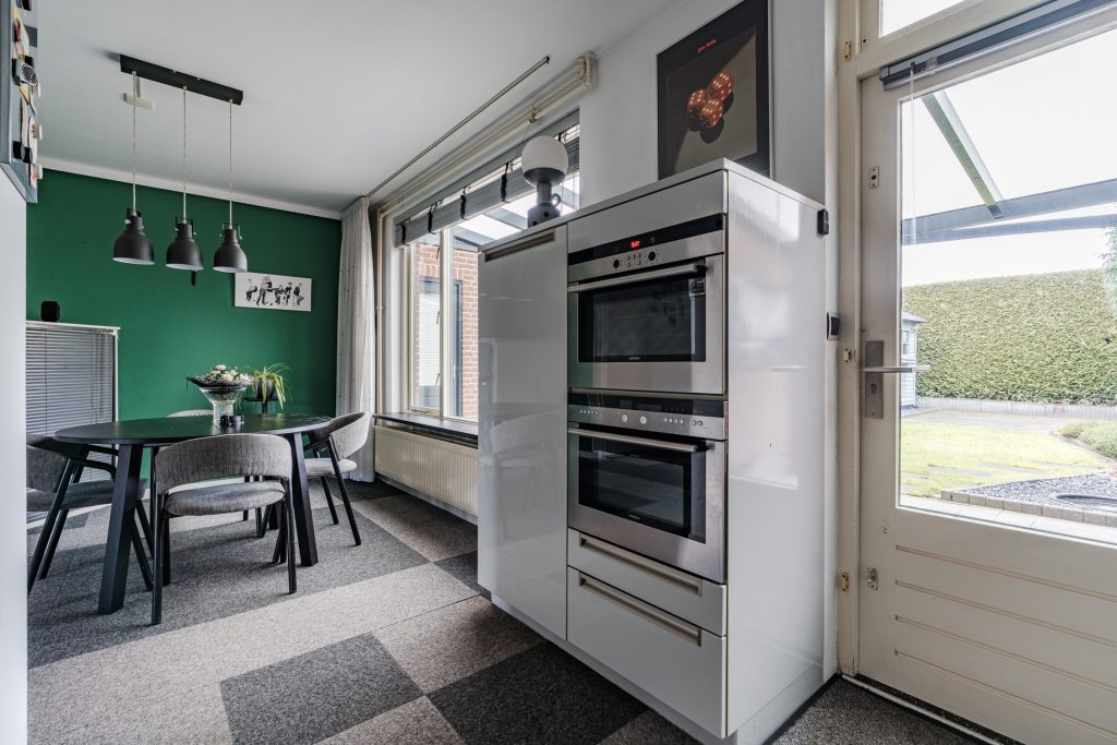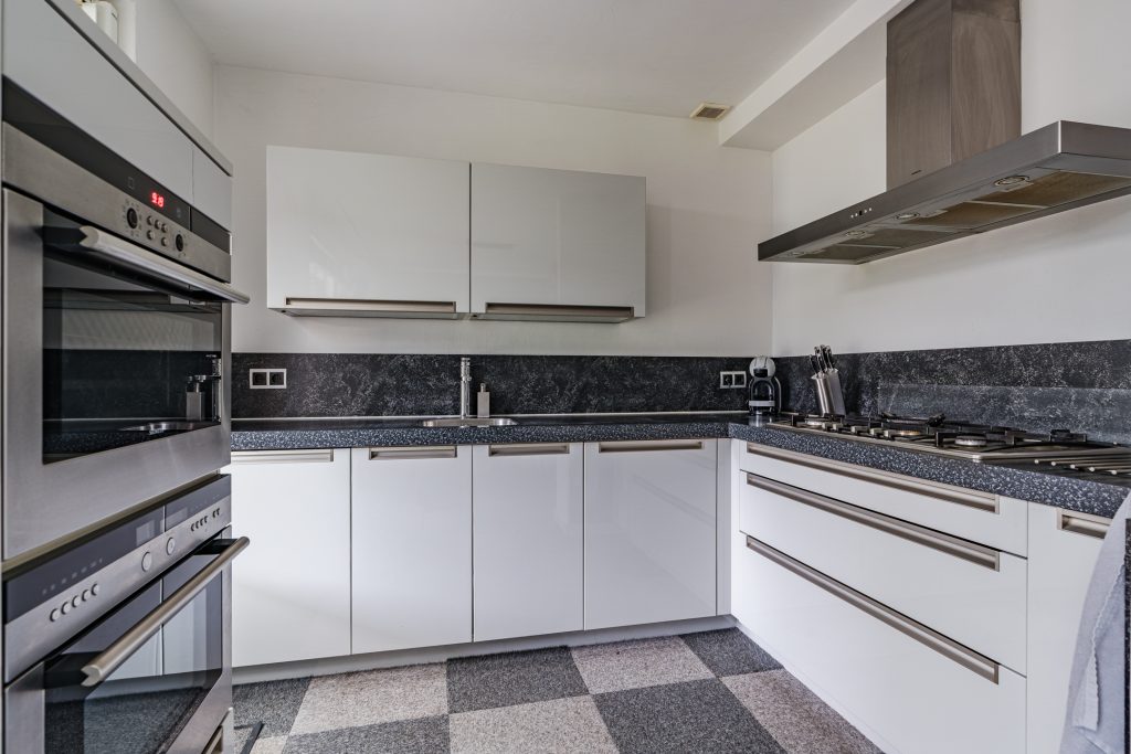 De keuken is modern uitgevoerd in een lichtgrijze kleurstelling en geplaatst in een hoekopstelling met een extra hoge kastenwand. Alle apparatuur is van Siemens en bestaat uit een vijf pits gasfornuis, afzuigkap, spoelbak, vaatwasser, oven, magnetron en koelkast. Via een loopdeur heb je direct toegang tot de achtertuin.