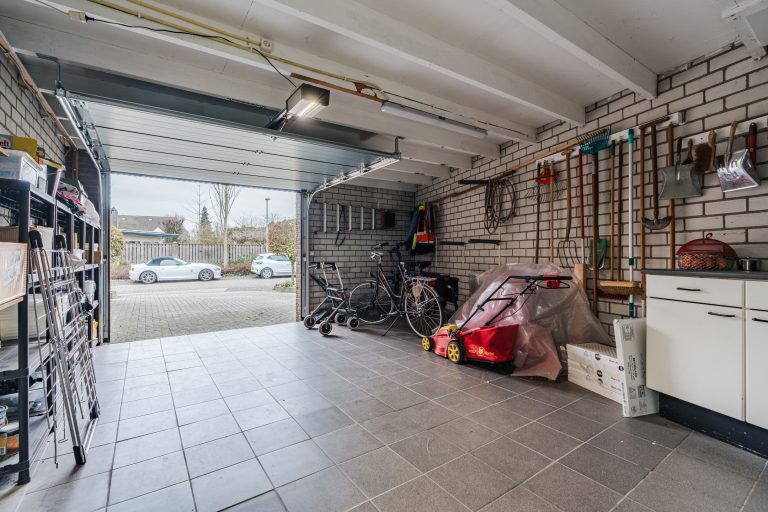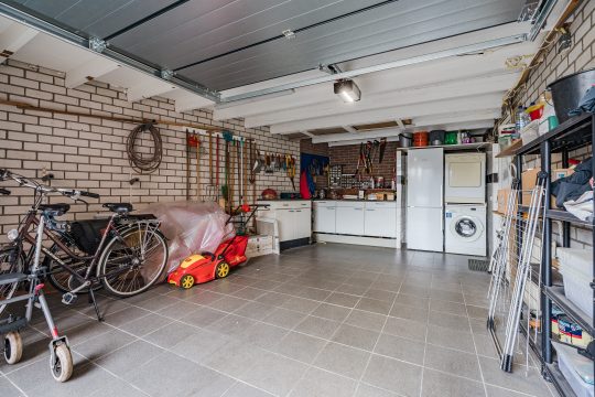 De aanpandige garage is geïsoleerd en verwarmd. De garage is voorzien van een tegelvloer, elektra, witgoedaansluitingen en een elektrische geïsoleerde garagedeur. De riante oprit biedt ruimte voor meerdere auto’s.
