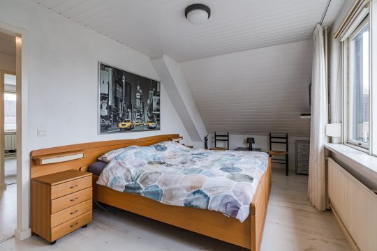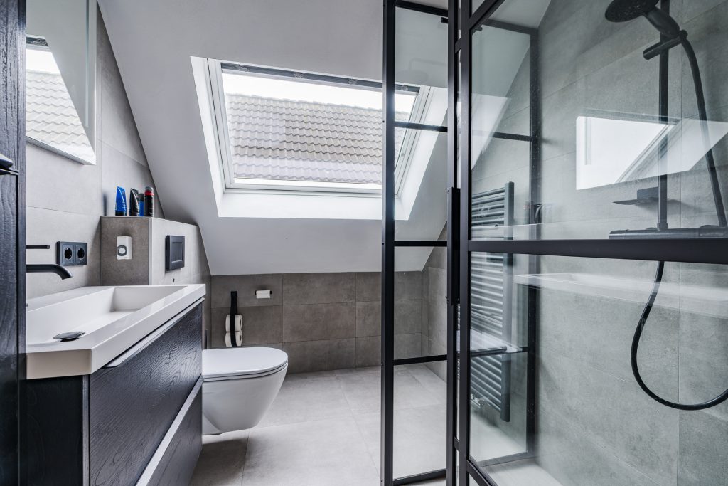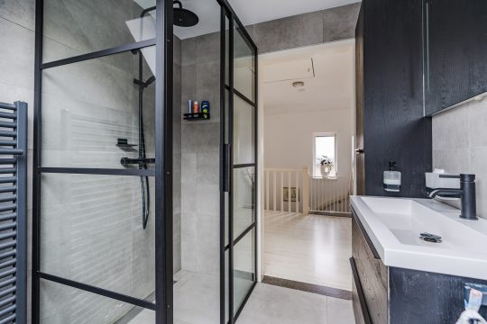 De badkamer is in 2021 volledig vernieuwd en luxe uitgevoerd. De ruimte is volledig betegeld en voorzien van een ruime inloopdouche met hand en regendouche, een badmeubel met wastafel en kast, een hangcloset en een designradiator. Inbouwspots, mechanische ventilatie en een Velux dakraam zorgen voor comfort en licht. Daarnaast beschikt de badkamer over vloerverwarming met een aparte thermostaat.
