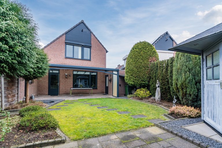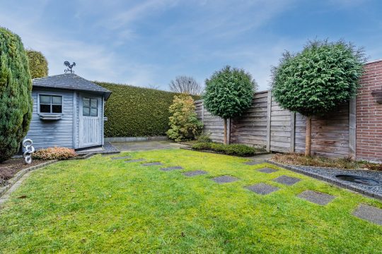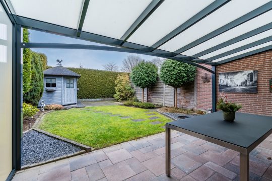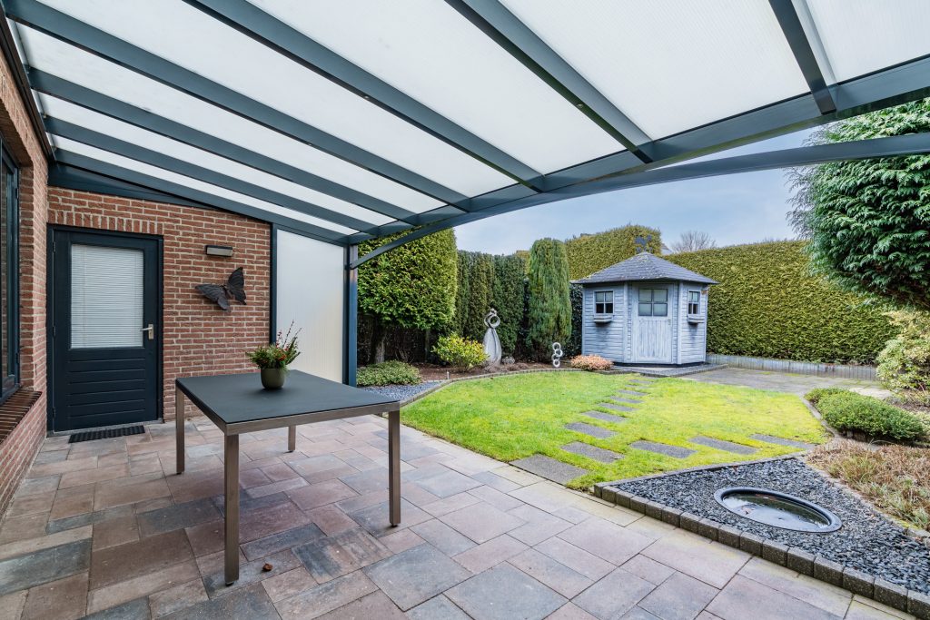 De achtertuin is groen en verzorgd aangelegd en biedt veel privacy. Je vindt hier een gazon, vaste beplanting, een tuinhuis met elektra en een buitenkraan. Direct aan de woning is een royale aluminium overkapping geplaatst, waardoor je hier een extra buitenruimte hebt die je een groot deel van het jaar kunt gebruiken.