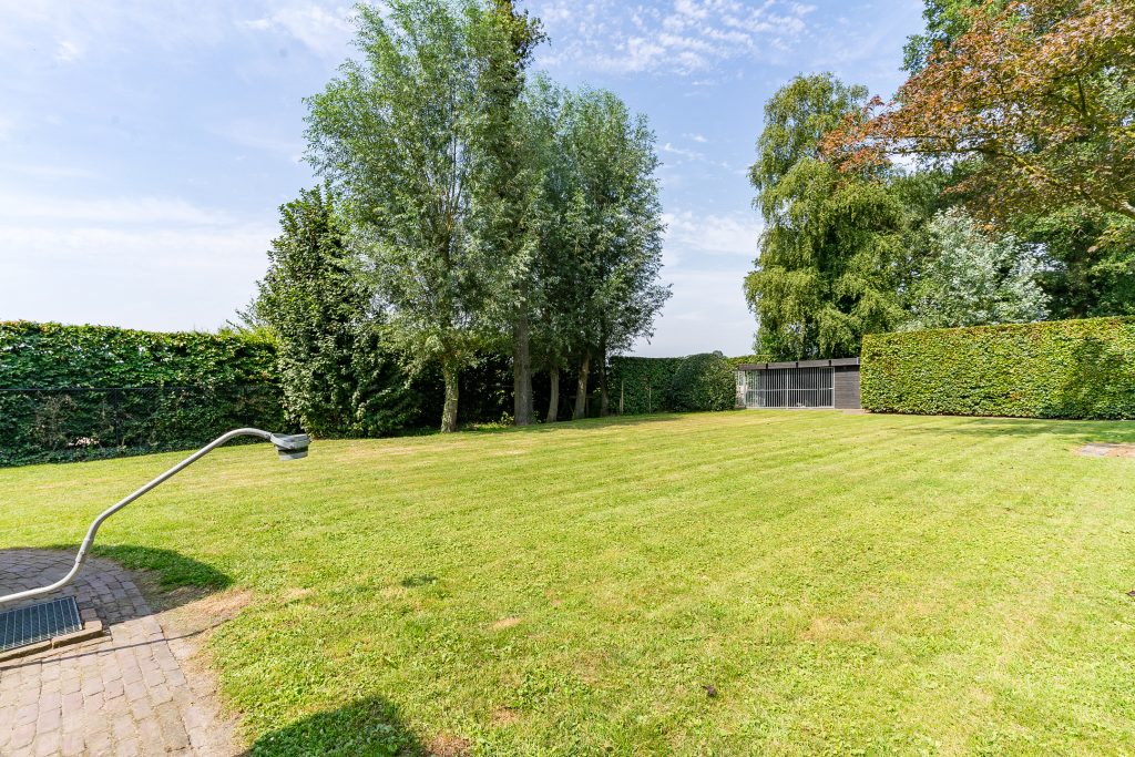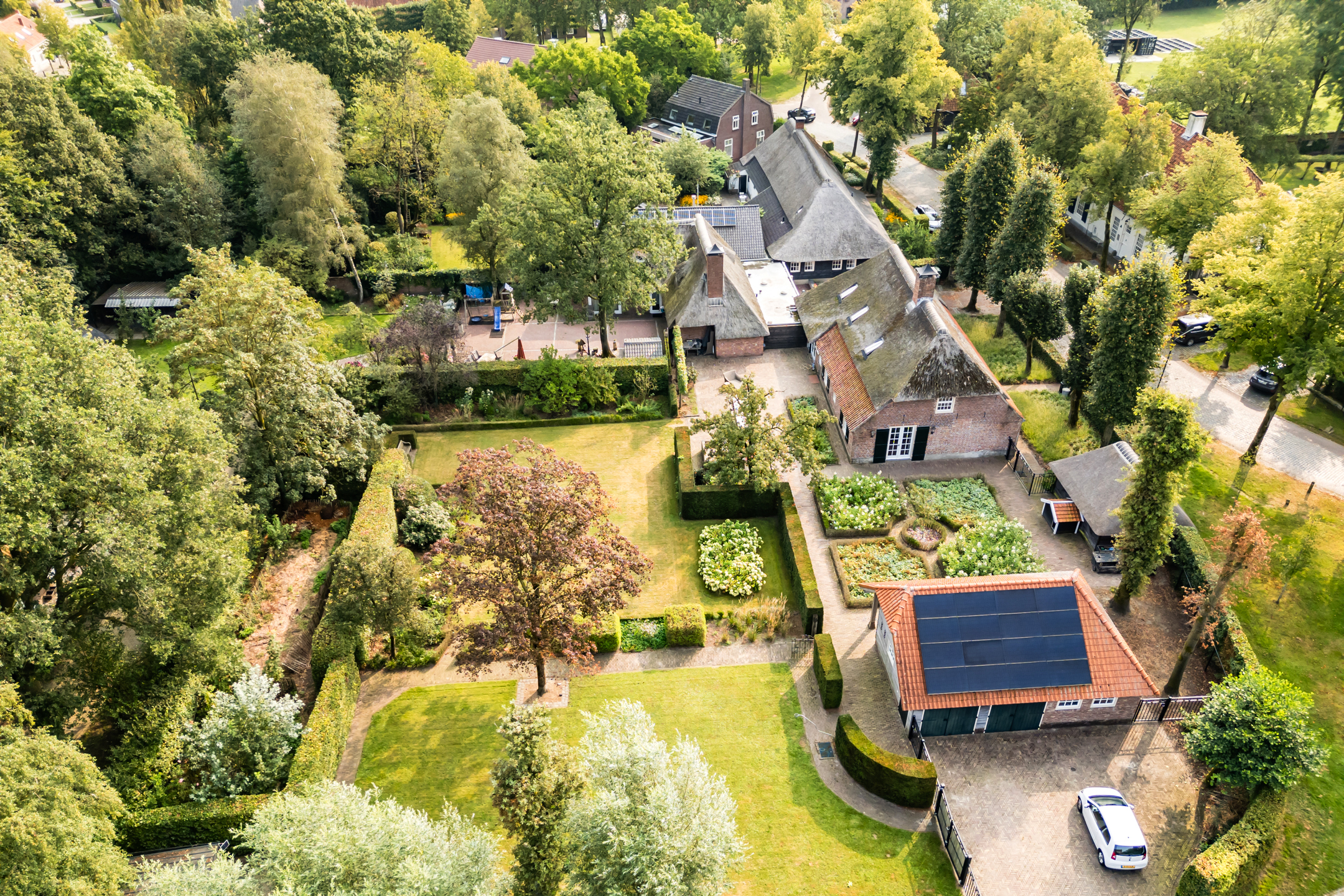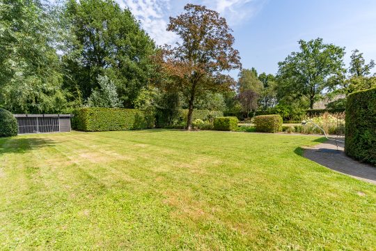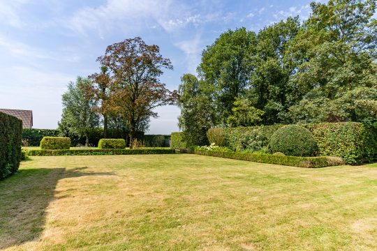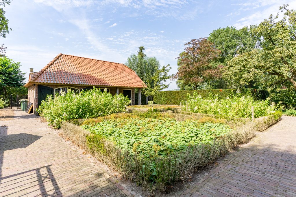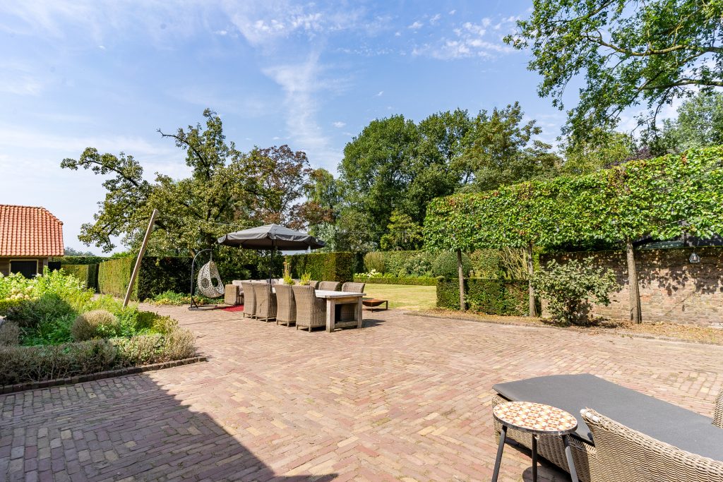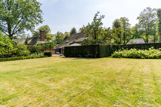 De verzorgde voortuin is aangelegd met diverse volwassen bomen, vaste beplanting en een stijlvolle beukenhaag die bijdraagt aan de landelijke uitstraling van het geheel.