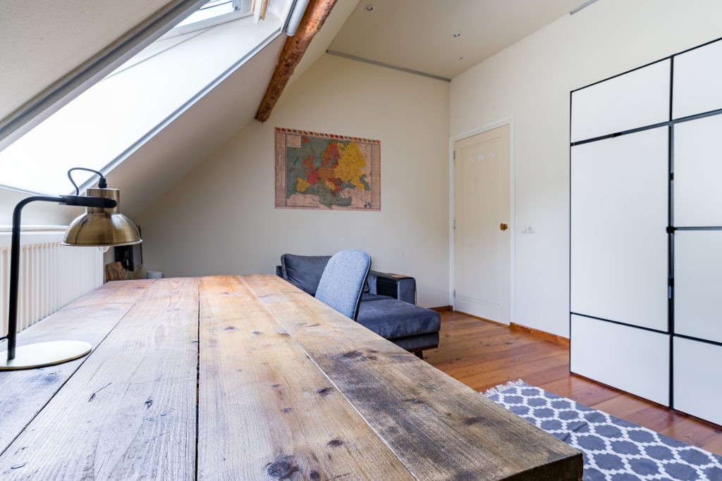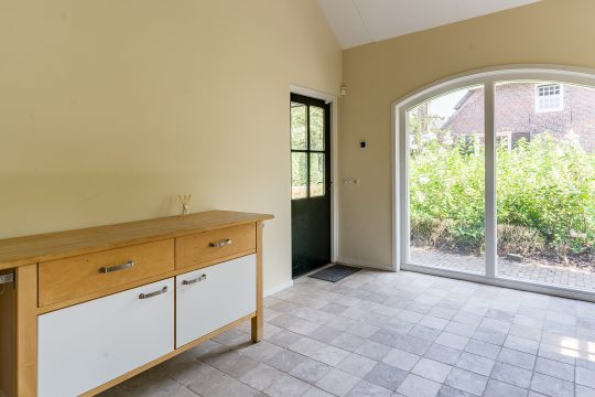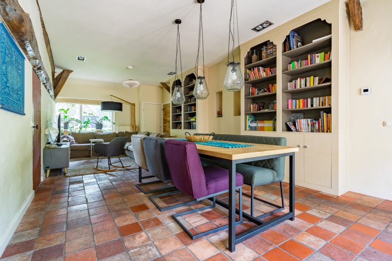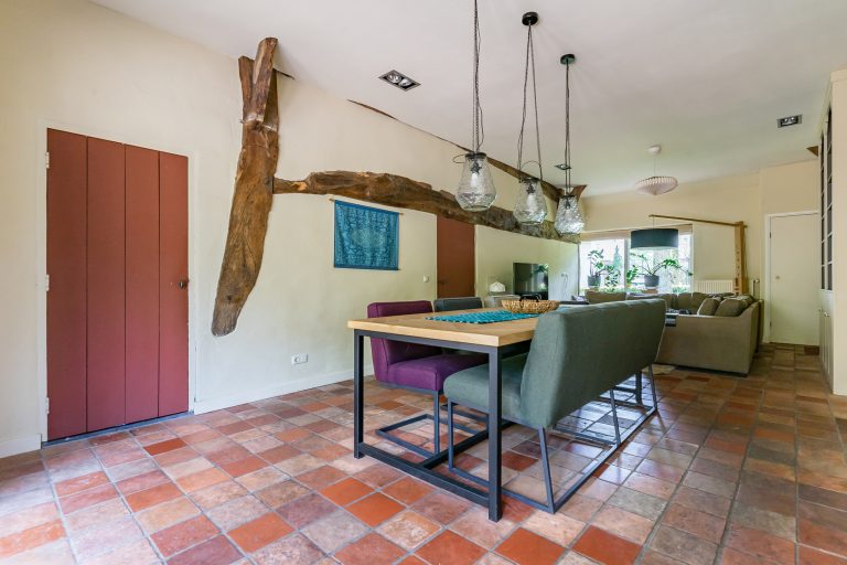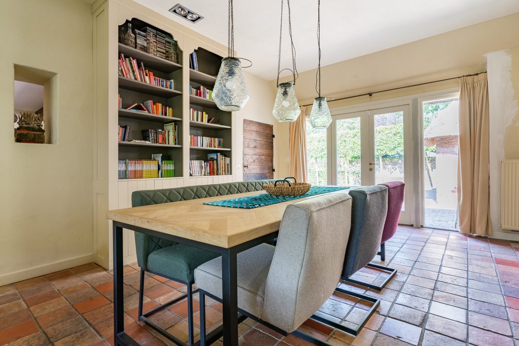 Direct rechts van de keuken bevindt zich een tweede woonkamer, die ook uitstekend dienst kan doen als eetkamer, werkkamer of speelkamer. Deze veelzijdige ruimte is afgewerkt met een plavuizenvloer, stucwerkwanden en een plafond met inbouwspots. Verder zijn hier de meterkast met ruim voldoende groepen en glasvezelaansluiting aanwezig, evenals twee plafondhoge boekenkasten en openslaande tuindeuren naar de achtertuin.