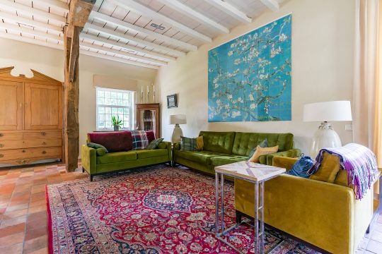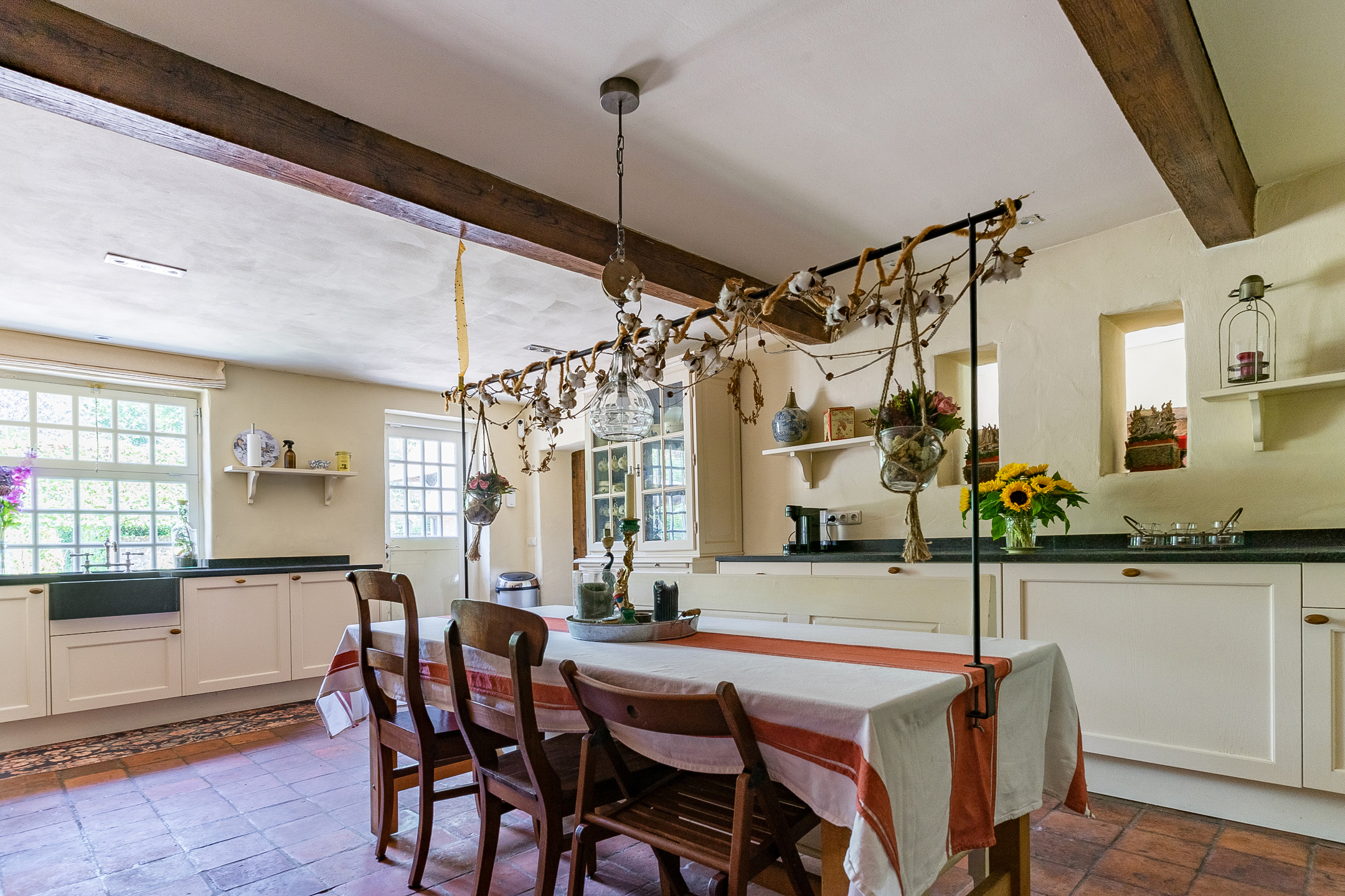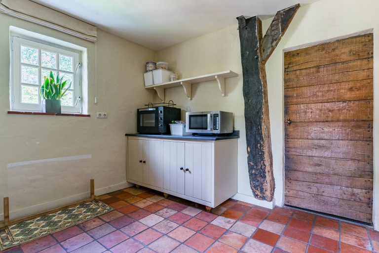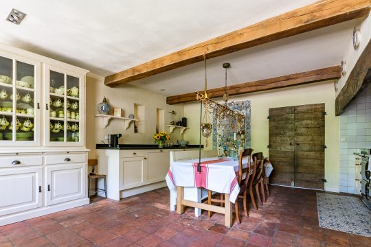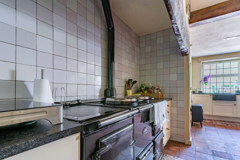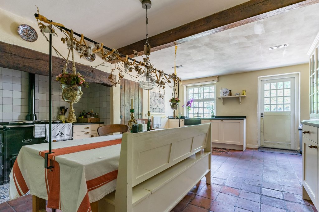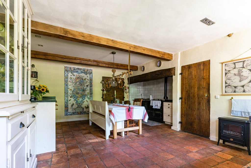 Het absolute hart van de boerderij is de schitterende leefkeuken. Hier komen sfeer, ruimte en functionaliteit perfect samen. De keuken beschikt over een plavuizenvloer met originele estrikken, stucwerkwanden en een strak plafond met inbouwspots. Via een deur is er directe toegang tot de achtertuin. De keuken is uitgerust met een imposant gietijzeren Aga-fornuis met twee kookpitten, drie ovens en een warmhoudoven – een droom voor iedere kookliefhebber. Daarnaast zijn er twee keukenblokken met hardstenen werkbladen, volop kastruimte en een vaatwasser.