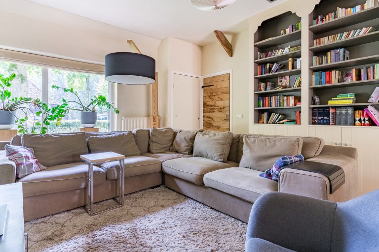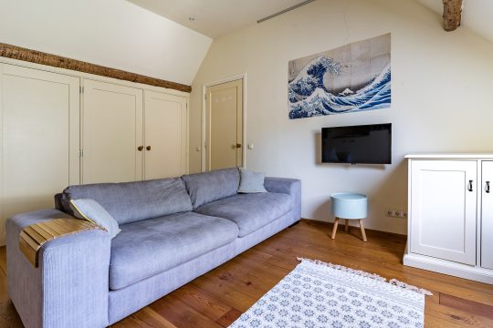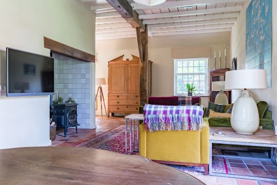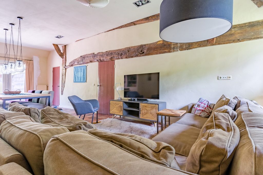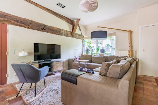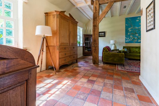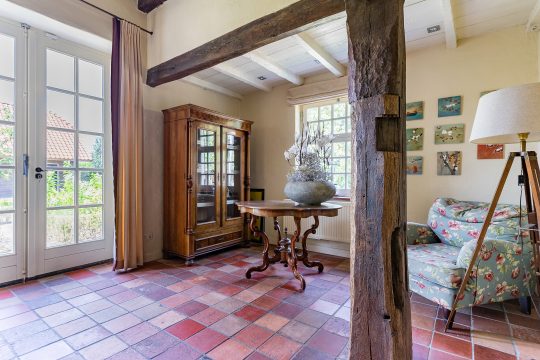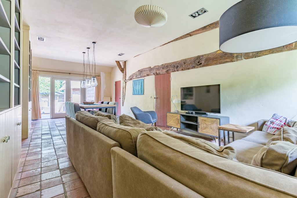 Aan de linkerzijde van de boerderij bevindt zich een zeer royale L-vormige woonkamer. Deze sfeervolle ruimte is afgewerkt met een plavuizenvloer, strak gestuukte wanden en een verhoogd balkenplafond met inbouwspots. Eyecatchers zijn de robuuste schouw met houtkachel en de riante maatwerk inbouwkast met ruime kluis. De openslaande tuindeuren zorgen voor een prachtige verbinding met de achtertuin en laten volop daglicht binnen.