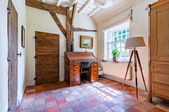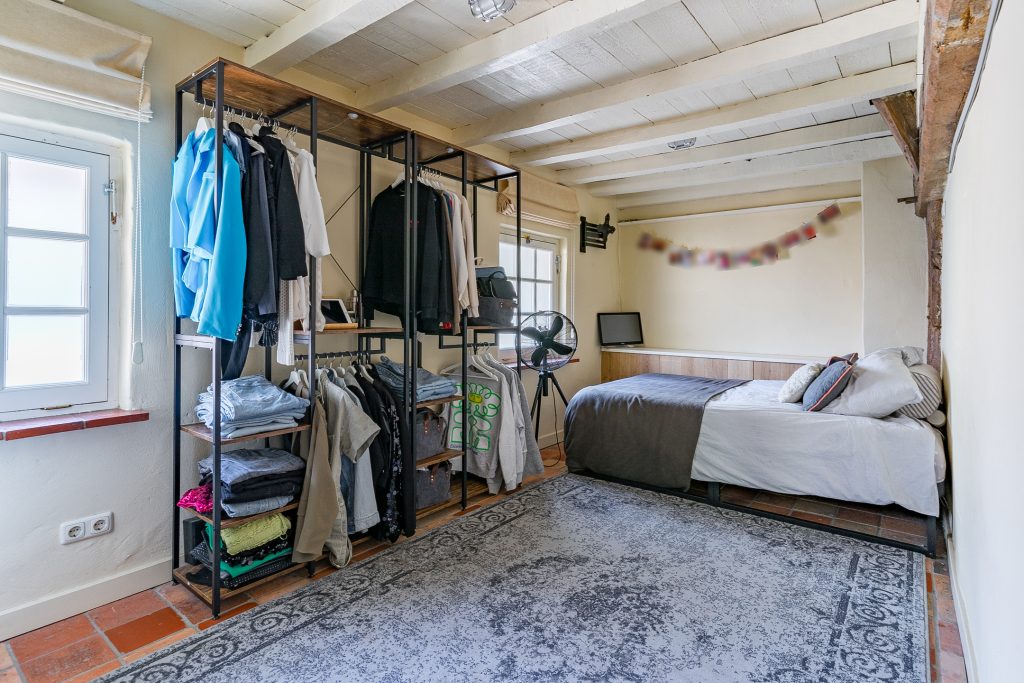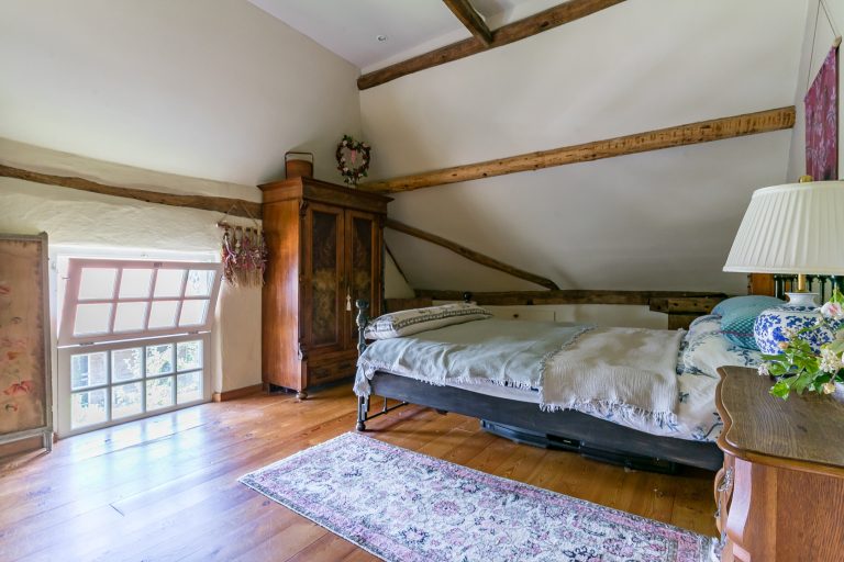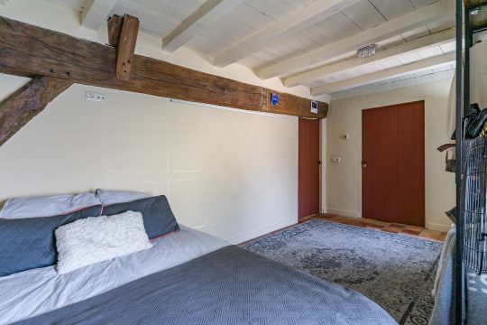 Aan de rechterzijde van de boerderij ligt een comfortabele slaapkamer op de begane grond, voorzien van een plavuizenvloer, stucwerkwanden en een karakteristiek balkenplafond. Vanuit deze slaapkamer is er directe toegang tot de badkamer.