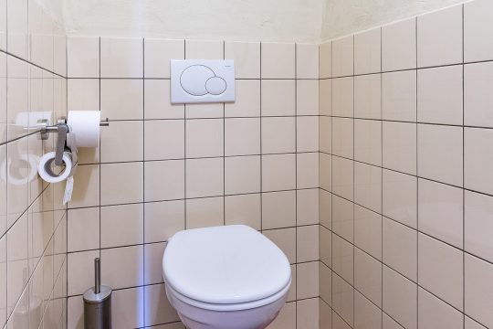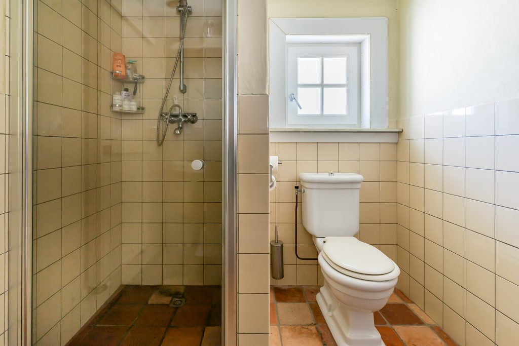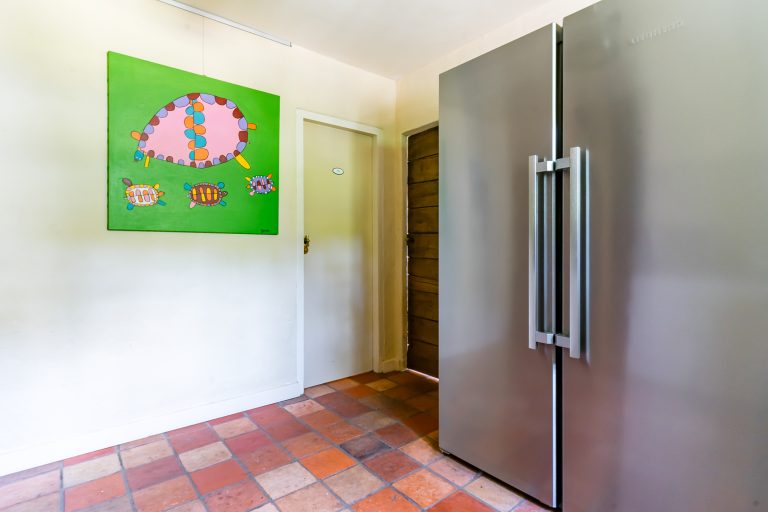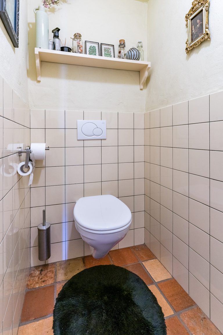 De praktische bijkeuken vormt de verbindende schakel tussen de woonkamer en de leefkeuken. Deze ruimte is voorzien van een plavuizenvloer, een functioneel keukenblok en een gedeeltelijk betegelde toiletruimte met wandcloset en fonteintje.