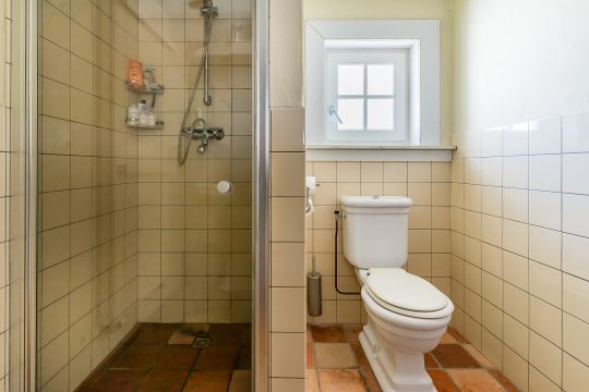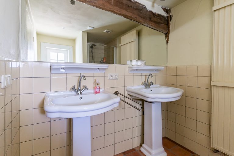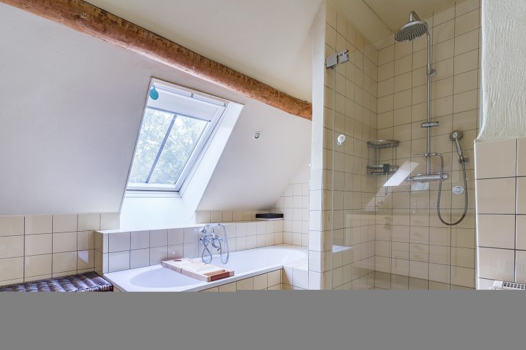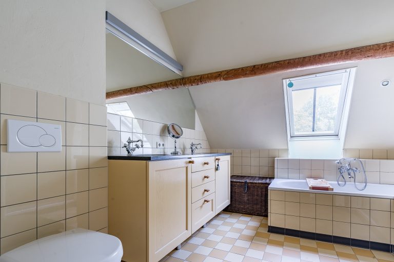 De tweede badkamer is gedeeltelijk betegeld en compleet uitgevoerd met een ligbad, douchecabine, wandcloset en een badmeubel met dubbele wastafel. Dankzij het Velux dakvenster is er prettig daglicht. De badkamer is verder voorzien van vloerverwarming en een stucwerkplafond met inbouwspots.