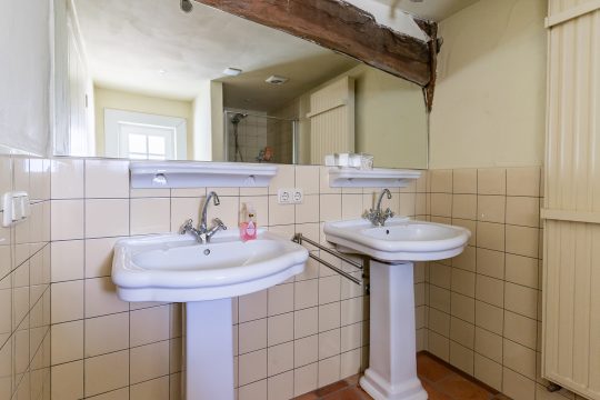 De badkamer is gedeeltelijk betegeld en beschikt over een douchecabine, toilet en twee wastafels. Het stucwerkplafond met inbouwspots zorgt voor een nette en moderne uitstraling.