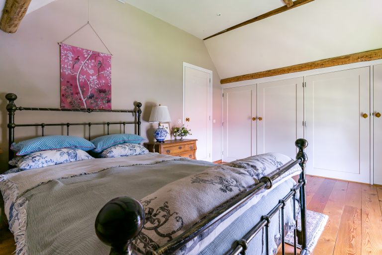 De masterbedroom aan de linkerzijde van de boerderij is ruim en comfortabel en afgewerkt met een grenenhouten plankenvloer, stucwerkwanden en een plafond met inbouwspots. Diverse ingebouwde kasten zorgen voor veel praktische bergruimte.