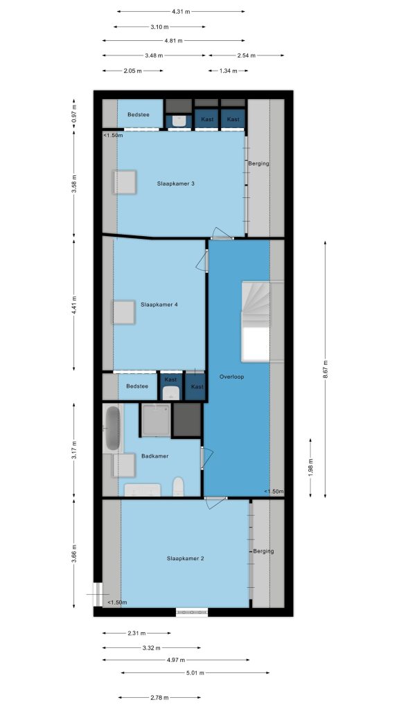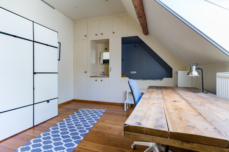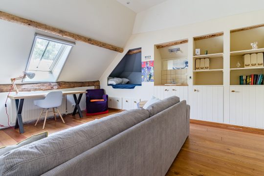 Slaapkamer drie en vier zijn eveneens royaal van opzet en kennen hetzelfde hoogwaardige afwerkingsniveau. Beide kamers beschikken over ingebouwde kasten, een wasbak en – als absoluut hoogtepunt – een prachtige ingebouwde bedstee die zorgt voor extra charme en karakter.