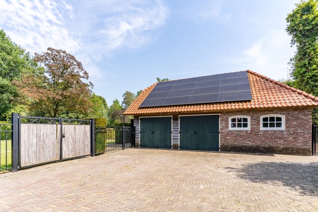 De dubbele garage is voorzien van twee dubbele houten deuren en een luik aan de buitenzijde dat toegang geeft tot een ruime bergzolder. Voor de garage ligt een brede oprit met parkeergelegenheid voor meerdere auto’s.
