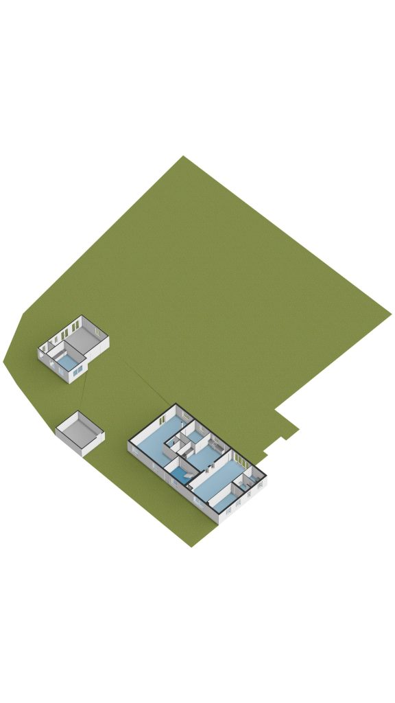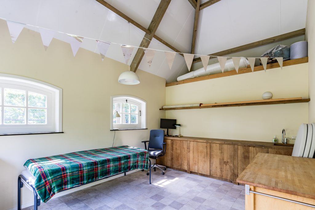 Achter op het perceel staat een royaal vrijstaand bijgebouw, bestaande uit een kantoorruimte/tuinkamer en een dubbele garage. De kantoorruimte of tuinkamer is fraai afgewerkt met een tegelvloer voorzien van elektrische vloerverwarming, stucwerkwanden en een keukenblok met close-in boiler. Met een eenvoudige doorbraak kan in de achtergelegen ruimte een badkamer worden gerealiseerd, waardoor deze ruimte uitstekend geschikt is als gastenverblijf of Bed & Breakfast.