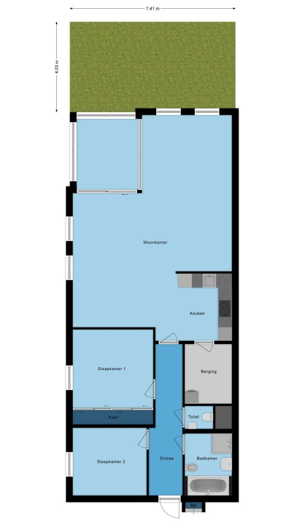 Buiten beschikt het appartement over een eigen voortuin van circa 7,5 bij 4 meter, die is bestraat en omheind met een sierhekwerk, wat zorgt voor een nette en verzorgde uitstraling.