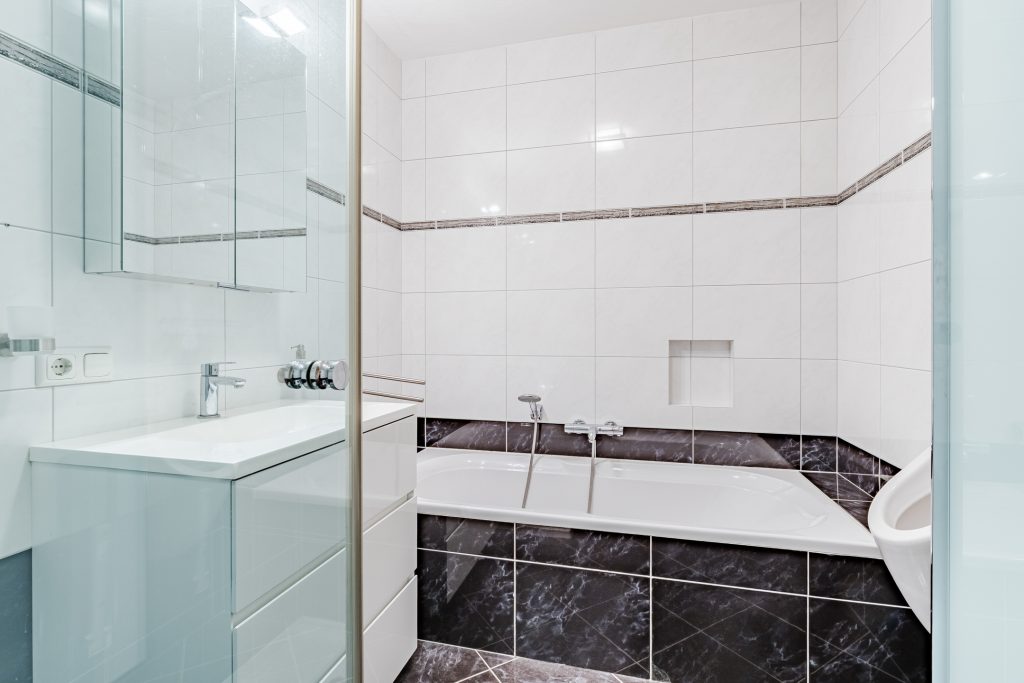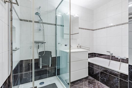 De volledig betegelde badkamer is compleet ingericht en beschikt over een ligbad, een douchecabine, een urinoir en een wastafelmeubel met wandkast en spiegelkast, wat bijdraagt aan het luxe karakter van de woning.