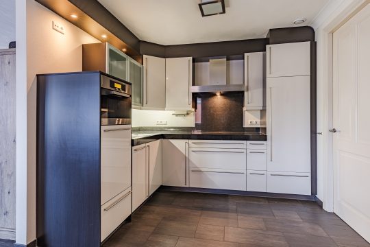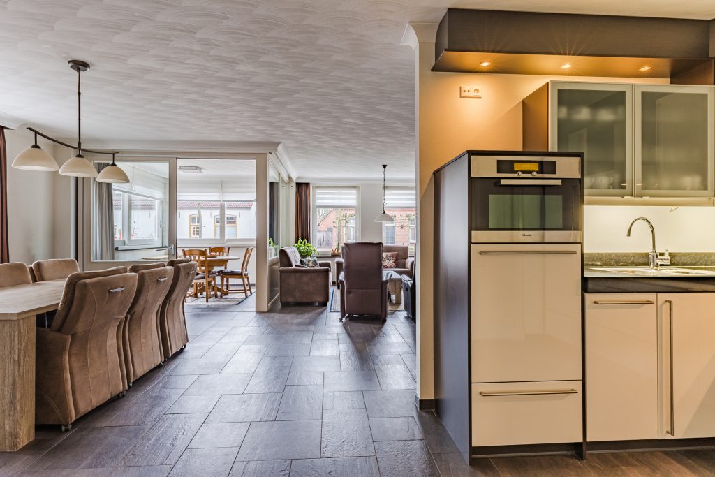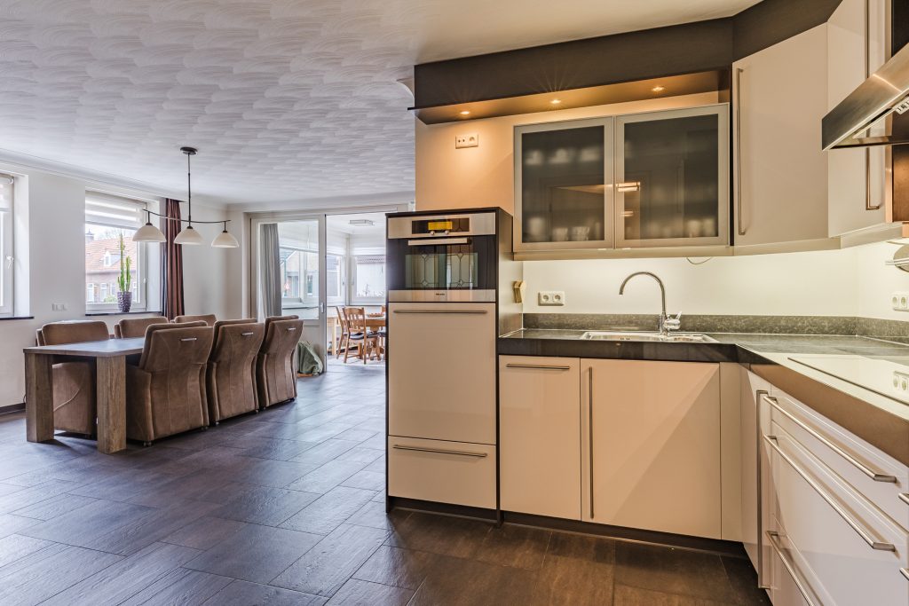 De open keuken sluit naadloos aan op de woonkamer en is uitgevoerd in een moderne hoekopstelling. De keuken is voorzien van een inductiekookplaat, afzuigkap, vaatwasser op hoogte, koelkast, combi-oven en een hardstenen aanrechtblad, waardoor koken hier een waar plezier is. Direct naast de keuken bevindt zich een praktische berging met voldoende opslagruimte, de wasmachineaansluiting en de verdeelunit van de vloerverwarming.