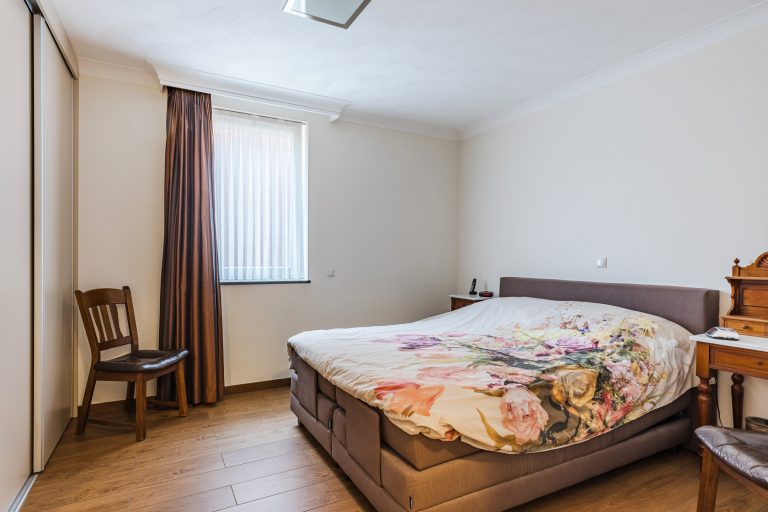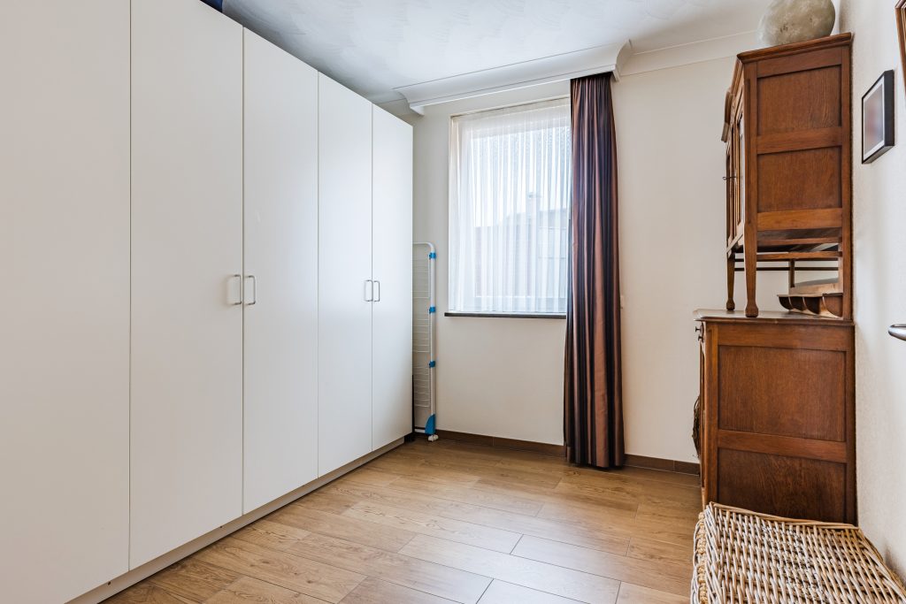 Het appartement beschikt over twee ruime slaapkamers, beide afgewerkt met een houtlook tegelvloer, strak gestucte wanden en een stucplafond met sierlijst. De hoofdslaapkamer biedt extra comfort dankzij de ingebouwde vierdelige kastenwand.